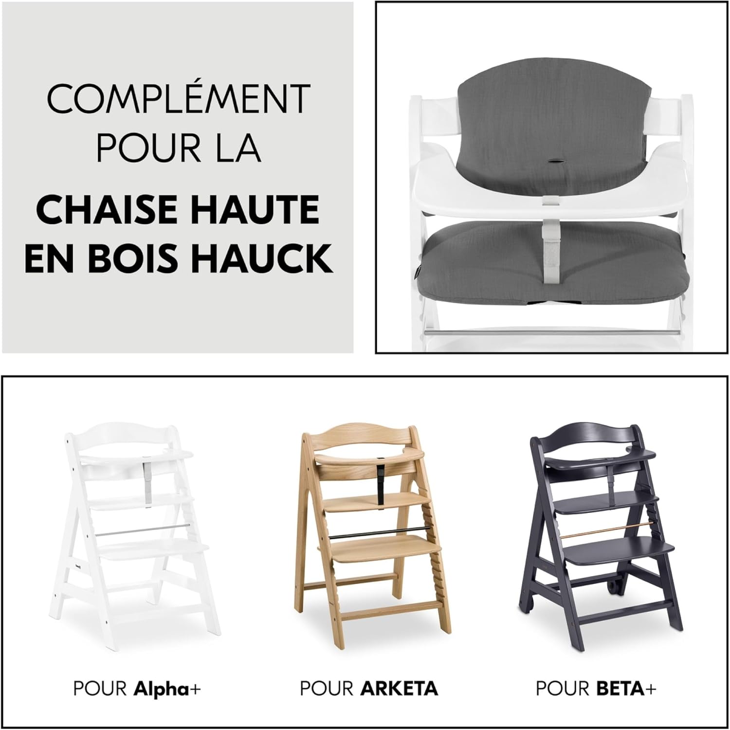 - Hauck's wooden high chairs are all equipped with a crotch strap and a 5-point harness. These can be used together with the high chair cushion. This ensures your baby is securely fastened at any age.