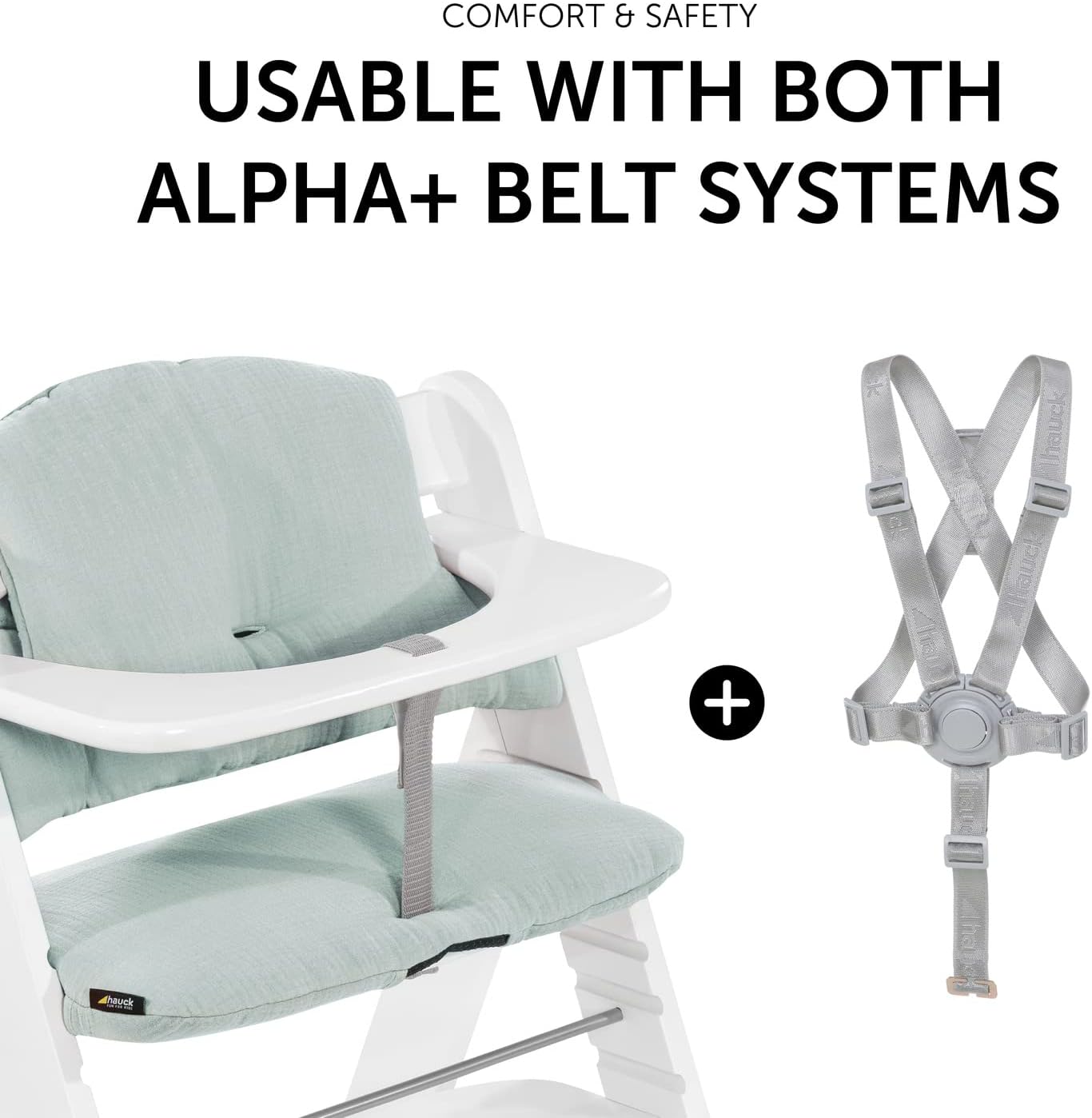 hauck wooden highchairs are all equipped with a crotch belt and a 5-point harness. You can also use both with the highchair seat pad. Your baby is well secured at any age.