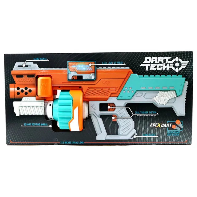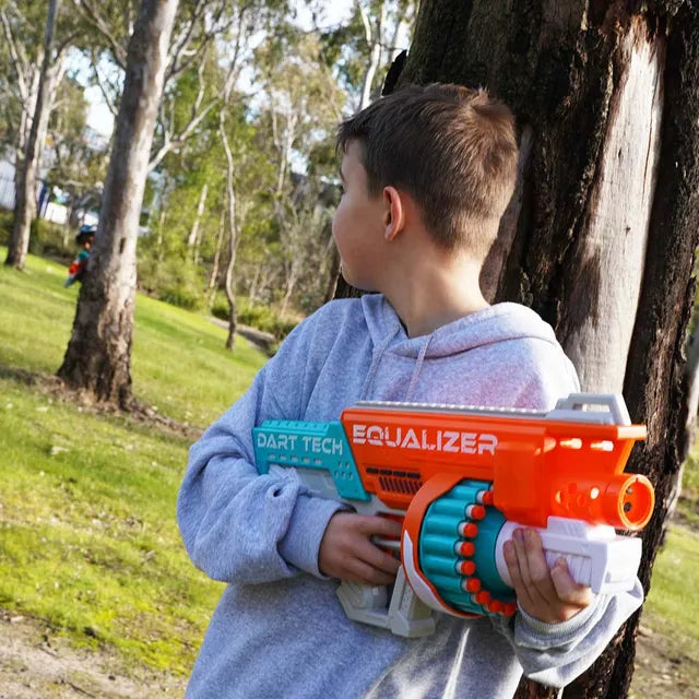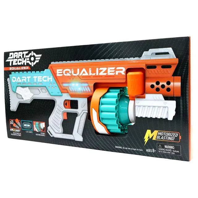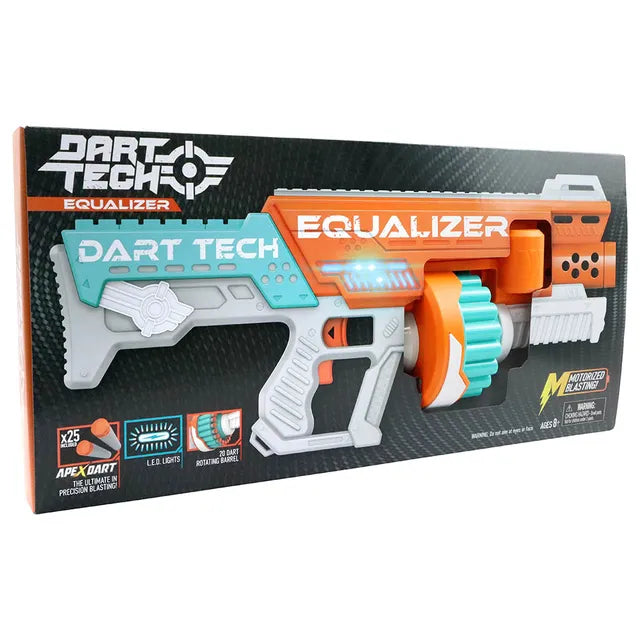 Upgrade your blaster game with the Dart Tech Equaliser! This fully motorised blaster has a 20 dart rotating barrel to overpower your targets. Featuring a dual trigger system, rapid fire up to 20 times before stopping to reload! This performance blaster comes with 25 x aerodynamic APEX darts ƒ?? designed to be the ultimate in precision blasting.