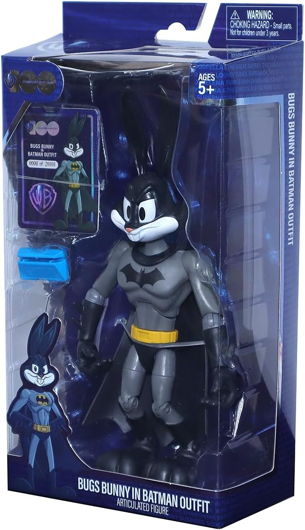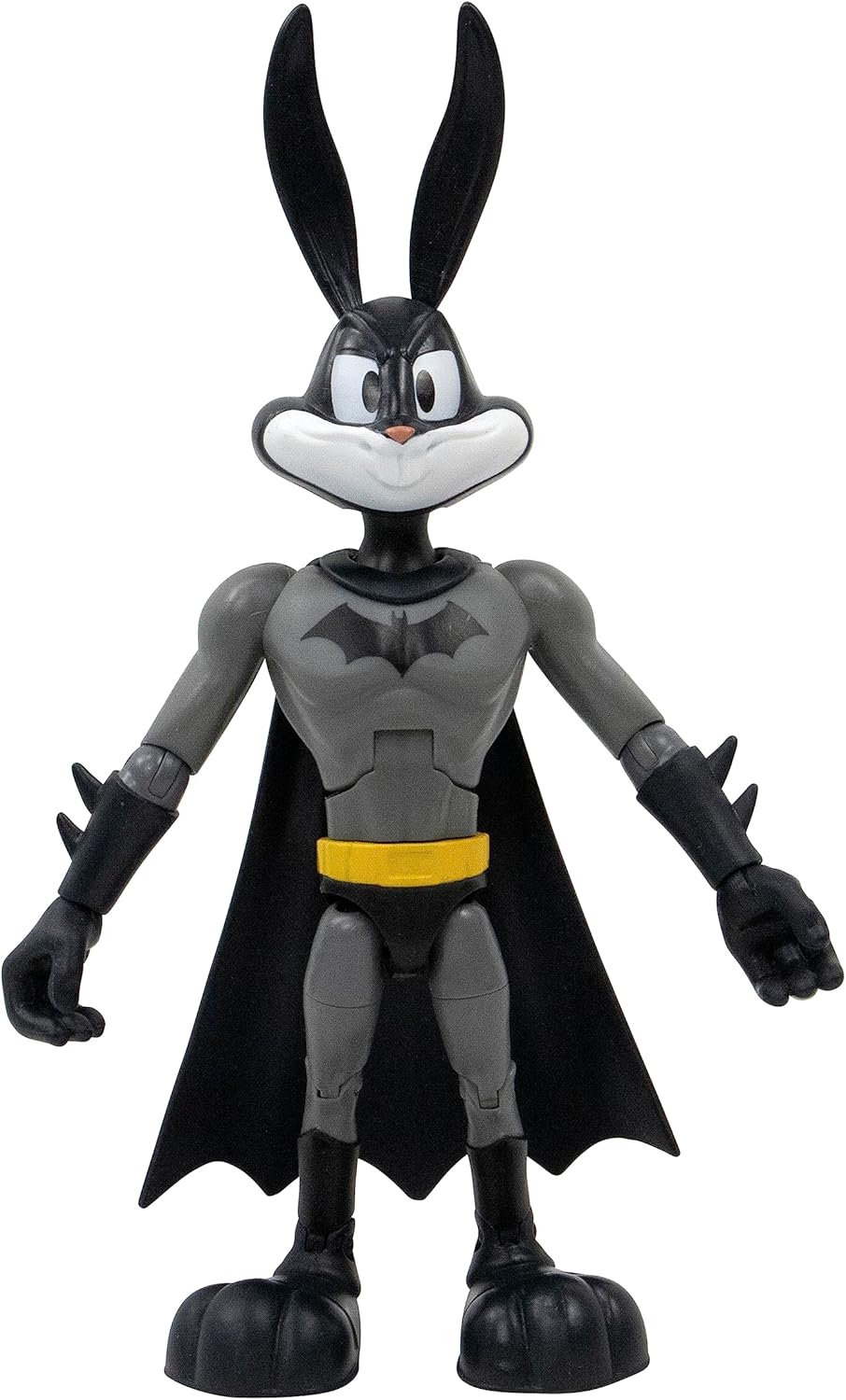 - This figure likely combines elements from both franchises, such as Bugs Bunny dressed in a Batman suit.