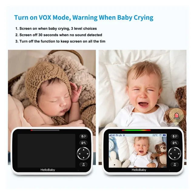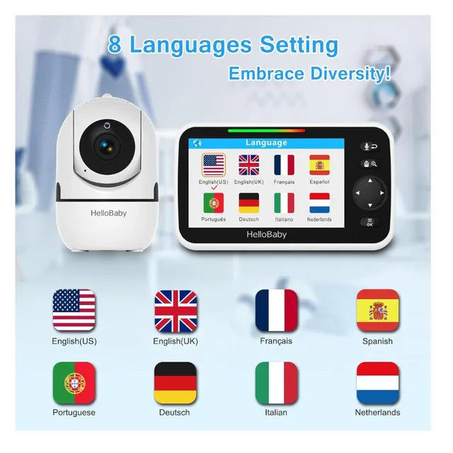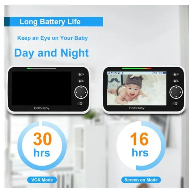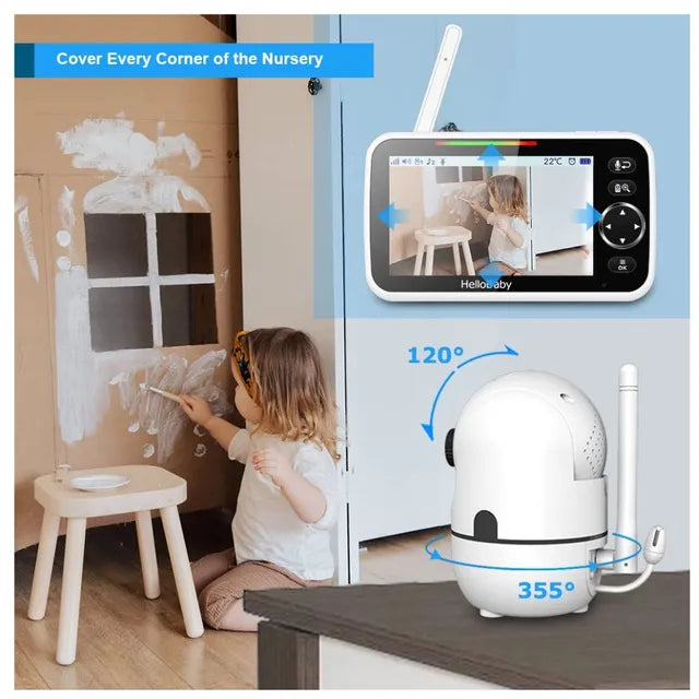 The HelloBaby Upgrade Baby Monitor features a 5-inch color display with infrared night vision, ensuring clear monitoring even in low light. It offers secure, non-Wi-Fi connectivity using 2.4GHz FHSS technology and supports up to 4 cameras. The monitor includes two-way audio, remote pan-and-tilt (355° horizontal, 120° vertical), 8 lullabies, and a room temperature alert. With a 1000-foot range, it provides a peaceful, secure environment for both parents and baby, all without subscription fees. Ideal for new parents or as a baby registry gift, it guarantees satisfaction with excellent customer support.