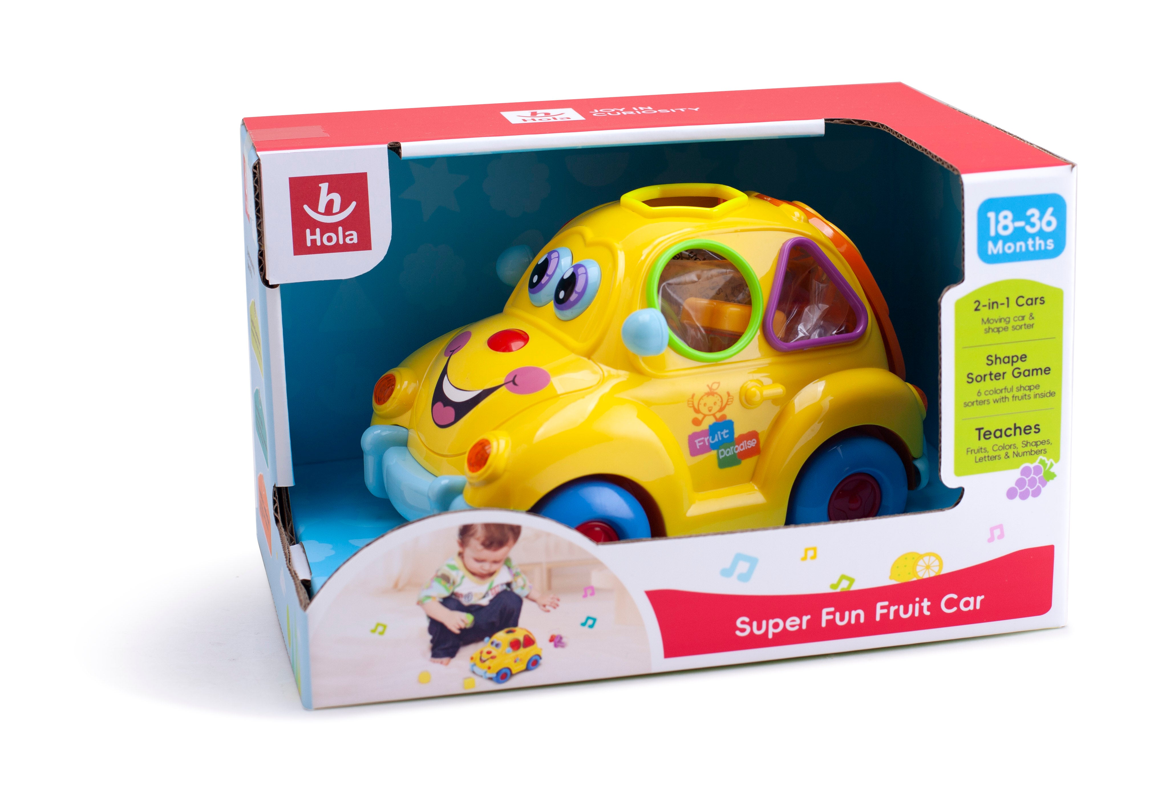 The popular Hola Super Fun Fruit Car is a fun-loving, shape sorting car that introduces children to the concept of numbers, letters, shapes, colours, and fruits.
