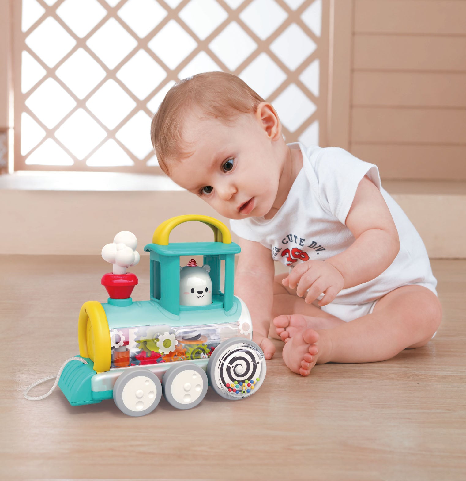 Hola Push Along Train Engine for Toddlers 6M+, Interactive Toy w/ Spinning Bear, Rotating Gears & Moving Smoke, Encourages Crawling, Hand-Eye Coordination, Sensory & Motor Skills, STEAM Toys - Yellow - The Hola Push Along Train Engine is a great way to encourage crawling and early development skills. It is suitable for children 6 months of age or older and is a great way to encourage early development skills like hand-eye coordination. As the train moves, your child will learn how to push and pull objects. The gears rotate inside the train, teaching your child about cause and effect. The little bear on the train will spin around, while the smoke from the train will billow up and down providing your child with visual stimulation.