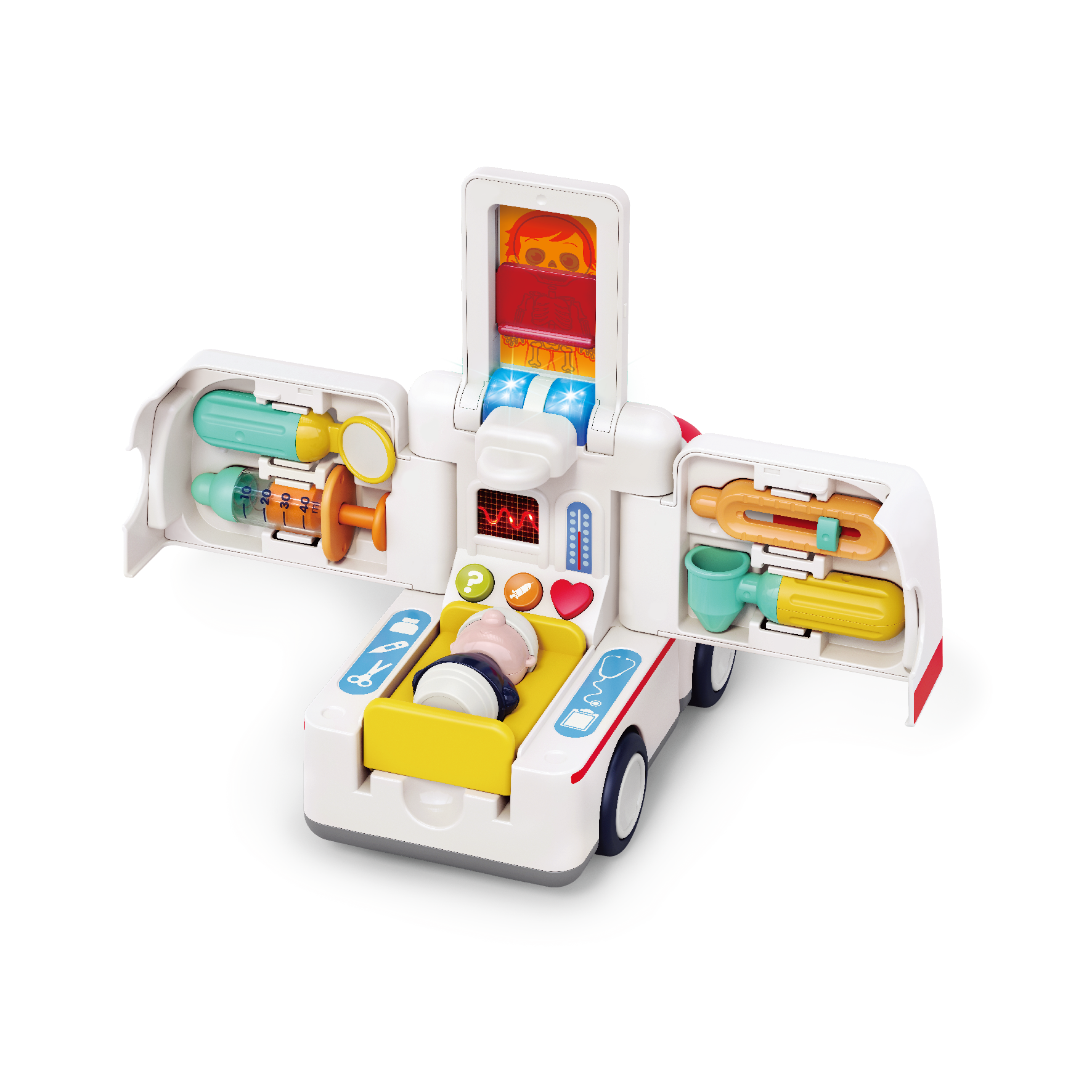 Equipped with nine medical tools, an adorable patient figure, bump-and-go mechanics, as well as music, lights, and sound effects, this ambulance not only adds charm to any play environment or toy collection but also serves as a fantastic tool for encouraging imaginative play and enhancing fine motor skills. Ideal for children aged three years and older.