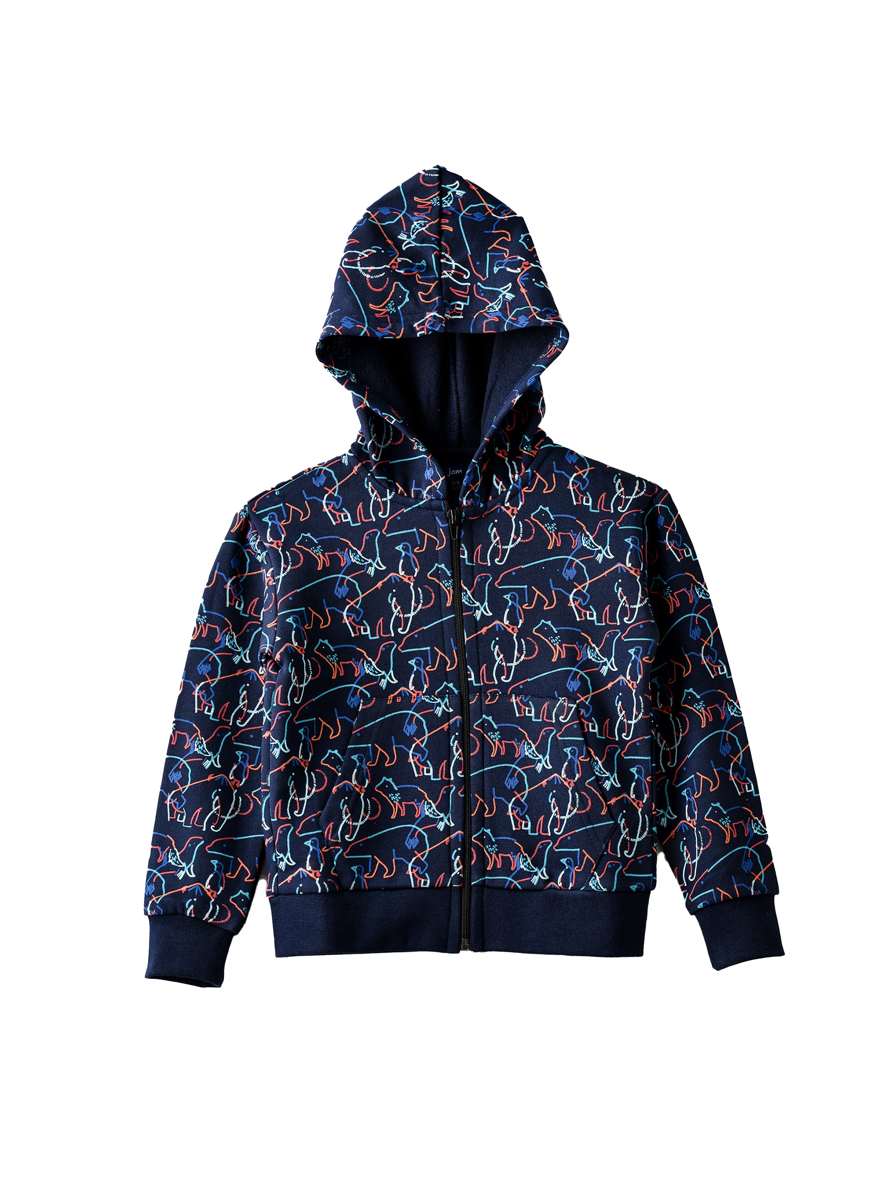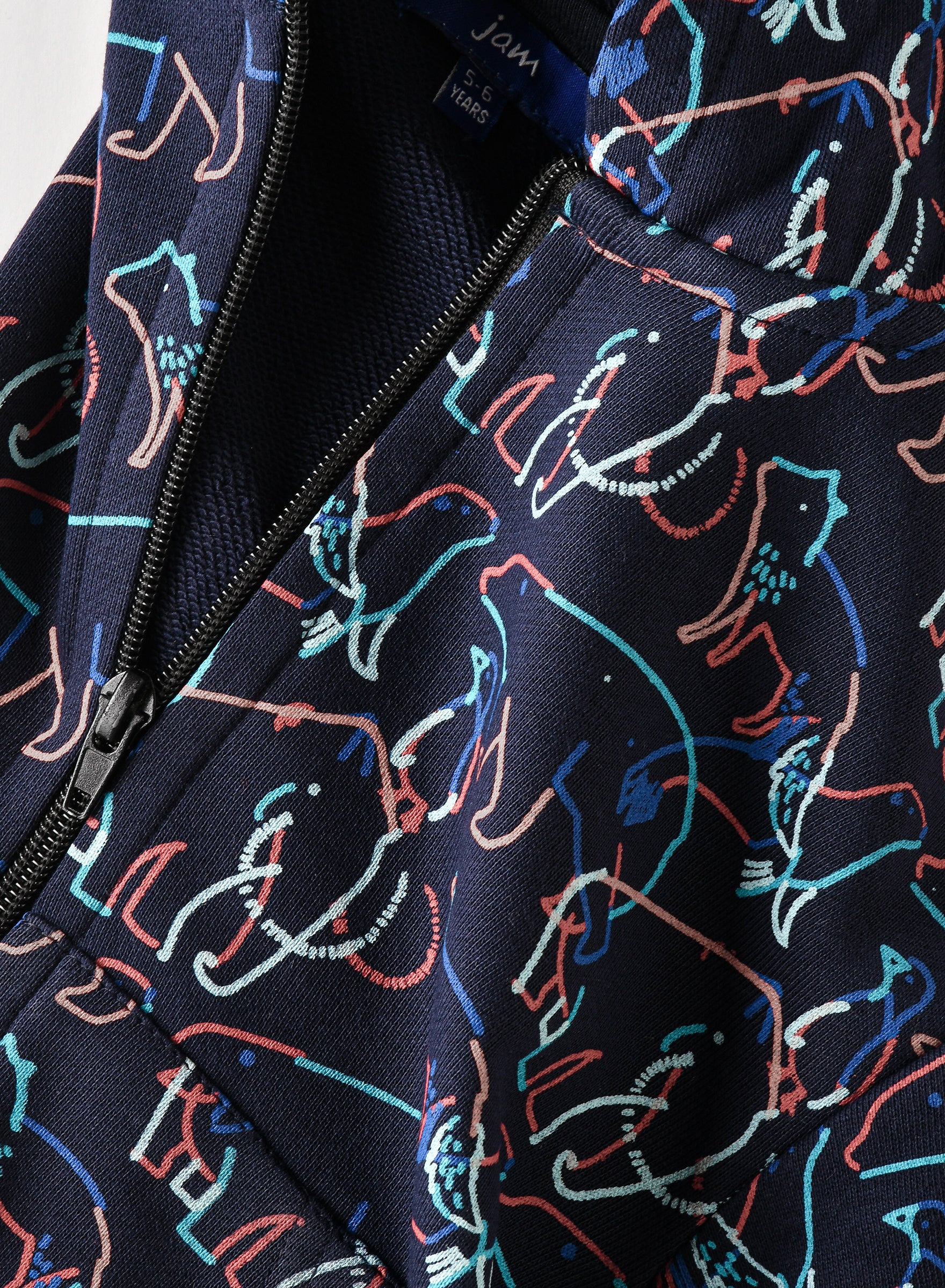 Jam's navy blue hoodie for boys with a fun animal print and zip-up closure. A perfect choice for your kid's everyday essentials for winter days. The fashionable hoodie offers a stylish combination, ensuring your child looks picture-perfect and effortlessly ready-to-go chic look.