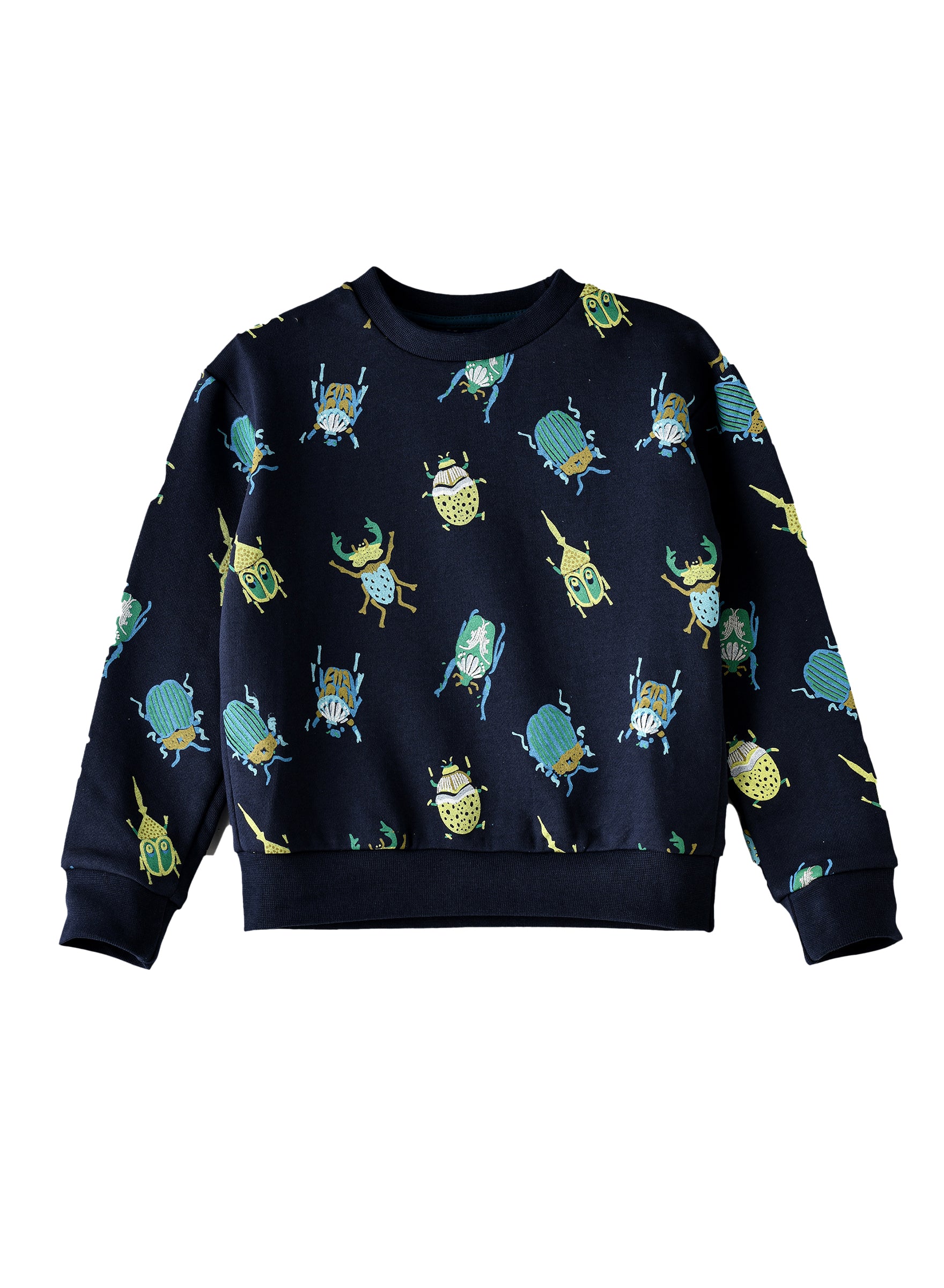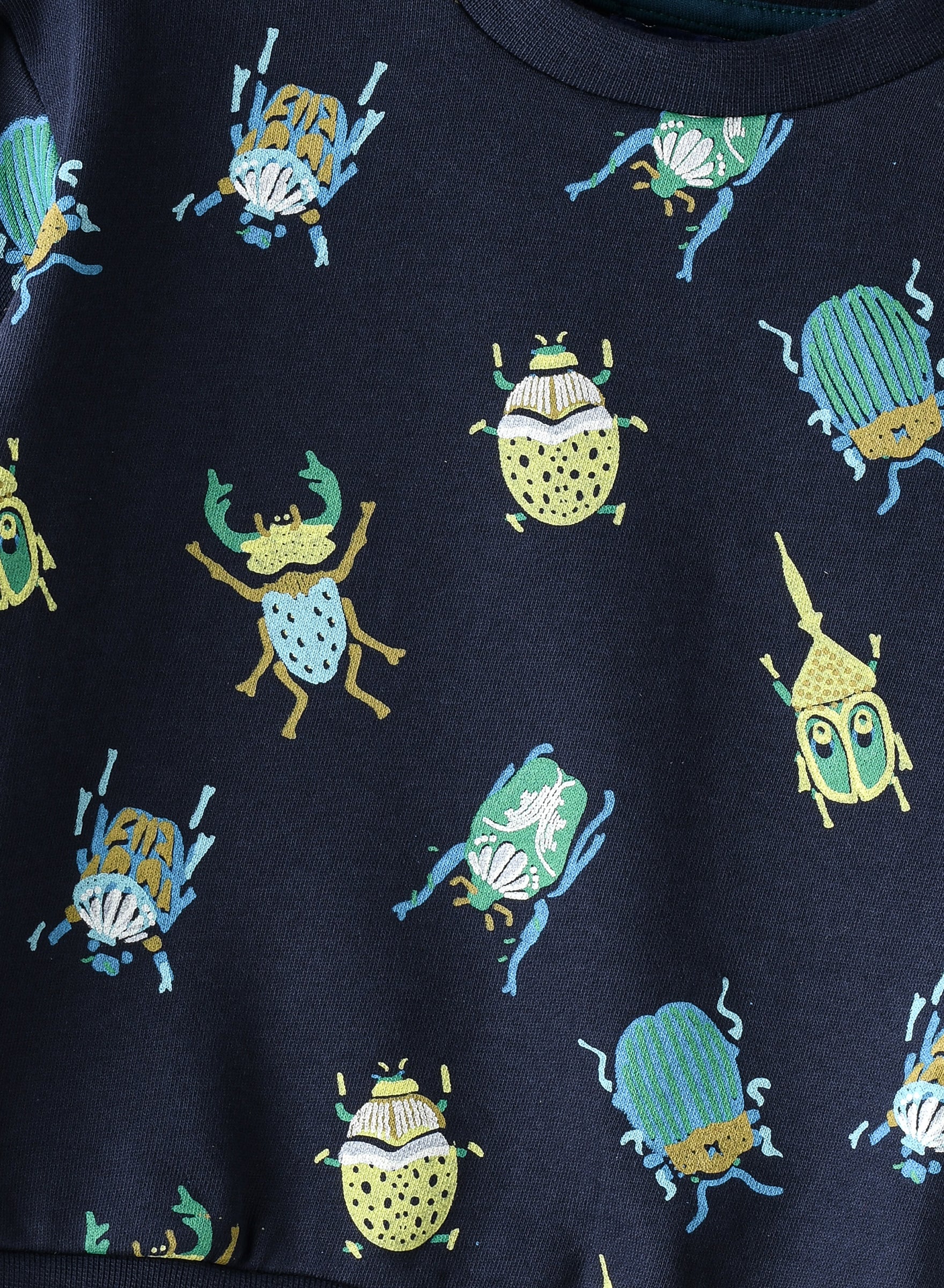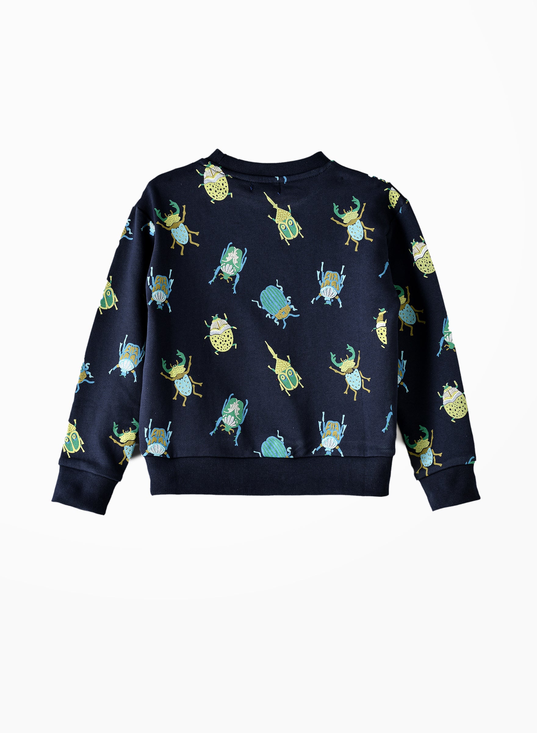 This Boys' Bug Print Crew Neck Sweatshirt in navy adds a playful twist to his wardrobe with its fun all-over bug print. Made from a soft cotton , this sweatshirt ensures warmth and comfort, making it perfect for cooler days. The classic crew neckline and ribbed cuffs and hem provide a snug fit and casual style, ideal for layering or wearing on its own. Whether for playtime, casual outings, or lounging at home, this sweatshirt is a must-have for his everyday wear.