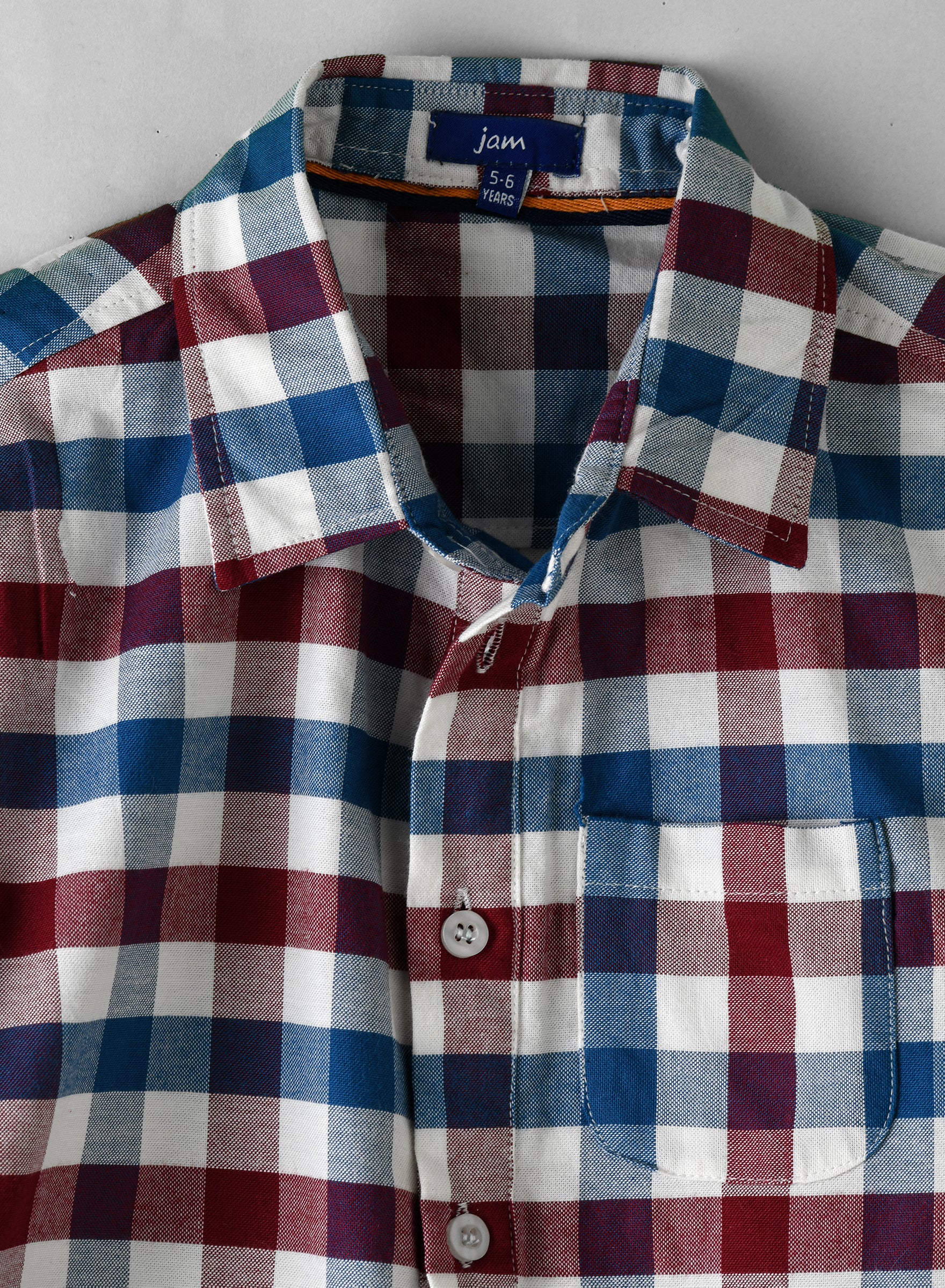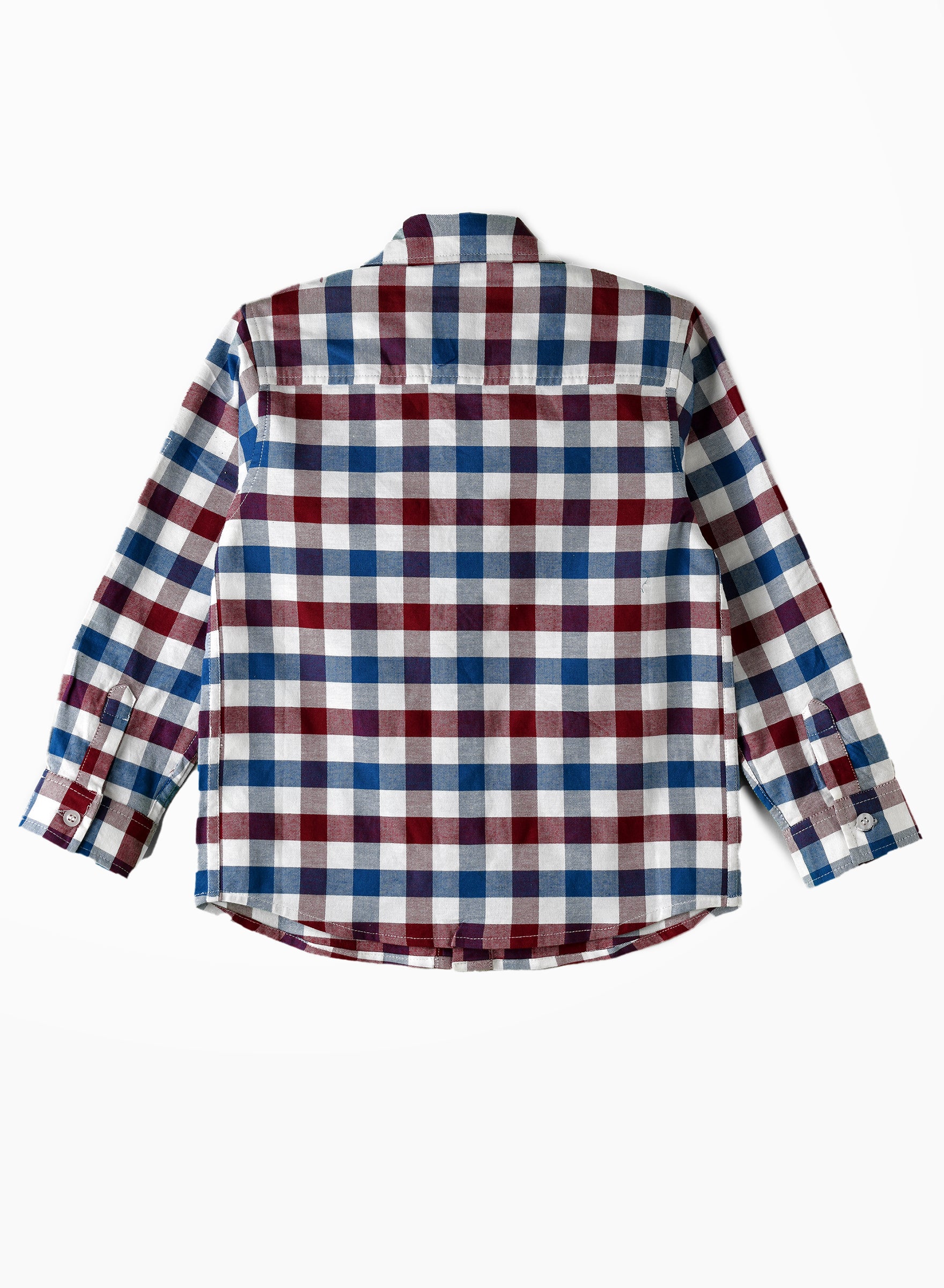 The Boys' Burgundy, Blue, and White Checkered Shirt is a stylish addition to any boy's wardrobe, featuring a bold checkered pattern in burgundy, blue, and white. Made from lightweight, breathable cotton, this long-sleeve shirt ensures all-day comfort, making it perfect for casual outings or semi-formal occasions. The button-up front and chest pocket add a polished touch, while the roll-up sleeves provide versatile styling options. Whether for family gatherings or playdates, this shirt is perfect for adding a pop of color and style.