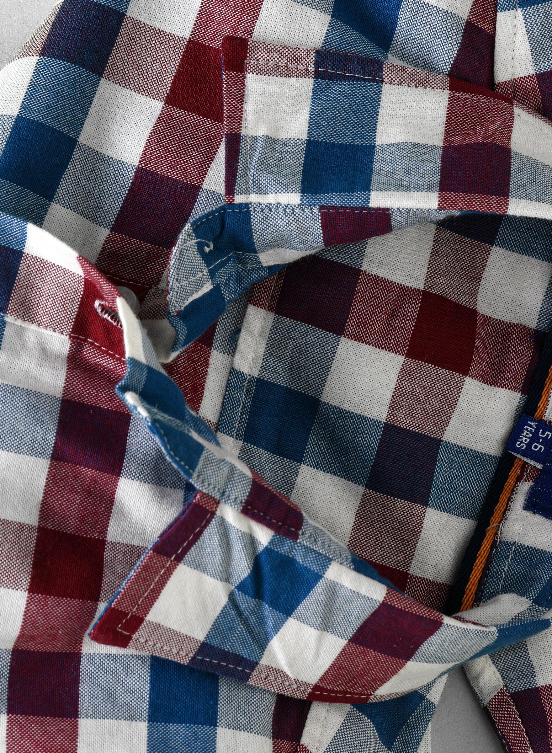 - Bold burgundy, blue, and white checkered pattern for a standout look.