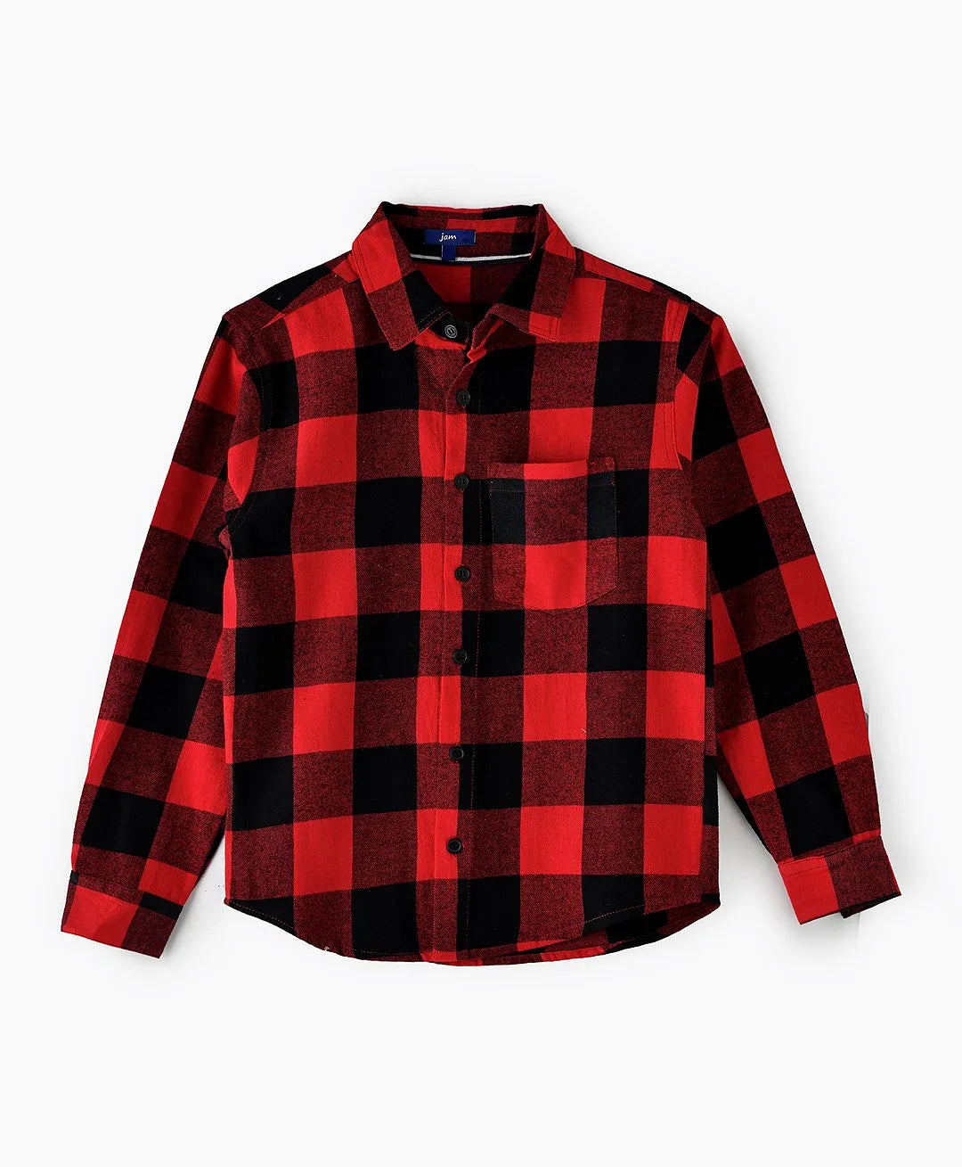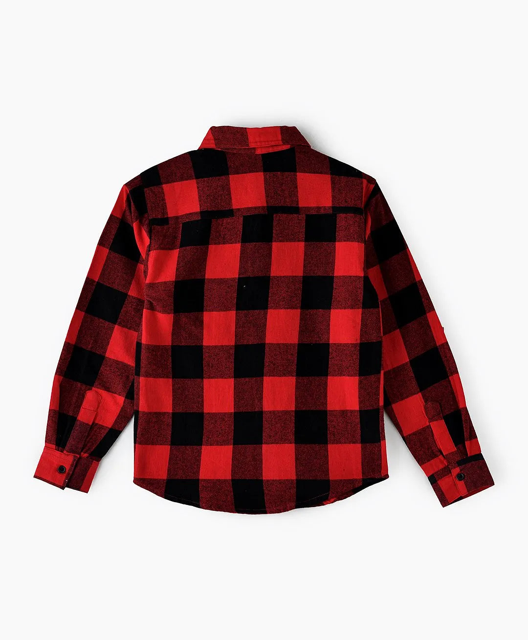 The Boys Red and Black Checkered Flannel Shirt is a timeless wardrobe staple, offering a classic look with its bold red and black checkered pattern. Crafted from soft flannel fabric, this long-sleeve shirt ensures warmth and comfort during cooler days. The traditional button-front closure and chest pocket add a polished touch, while its versatile design makes it perfect for layering over a t-shirt or wearing on its own. Whether for casual outings or family gatherings, this flannel shirt is a must-have for any boys wardrobe.