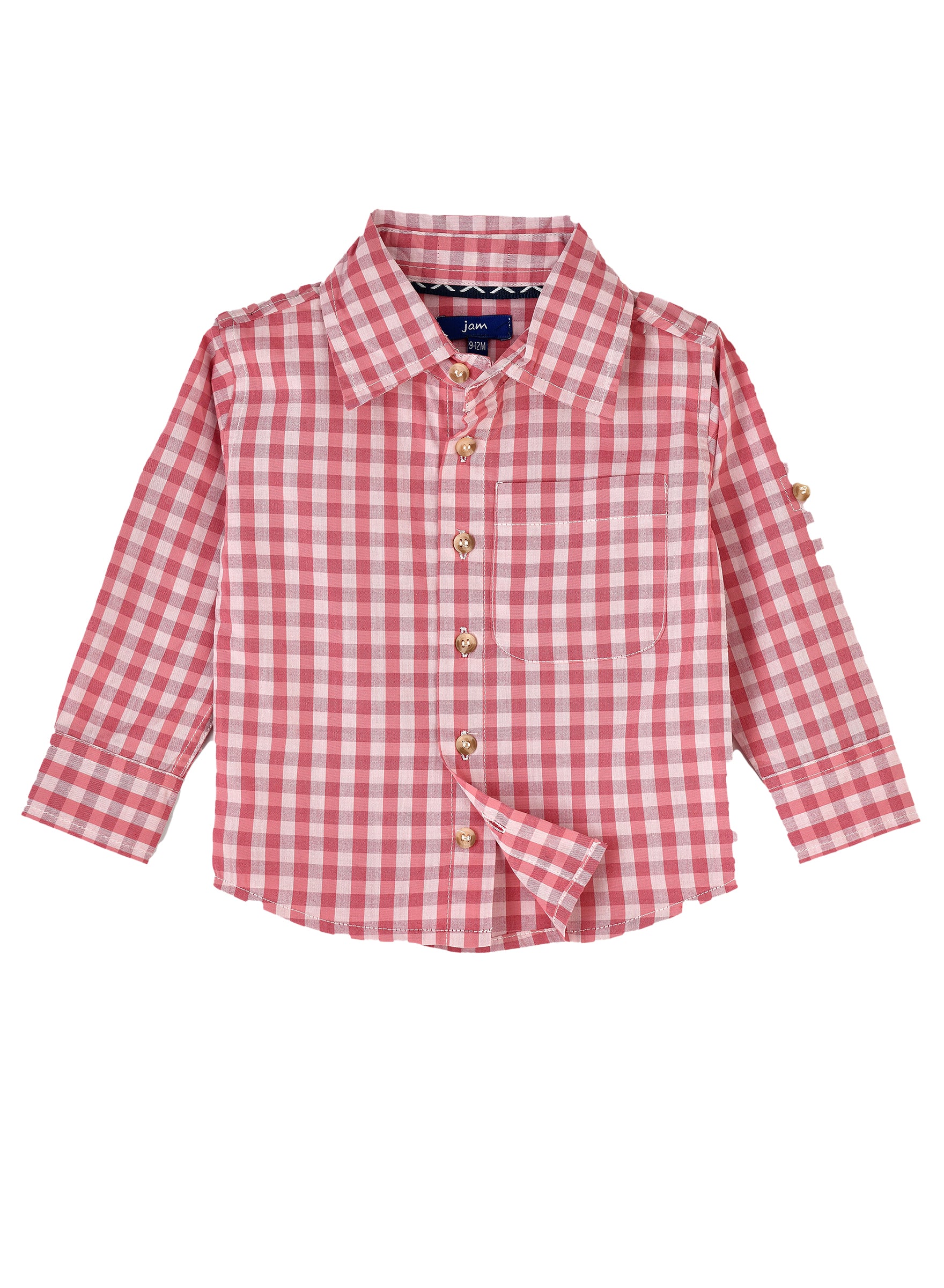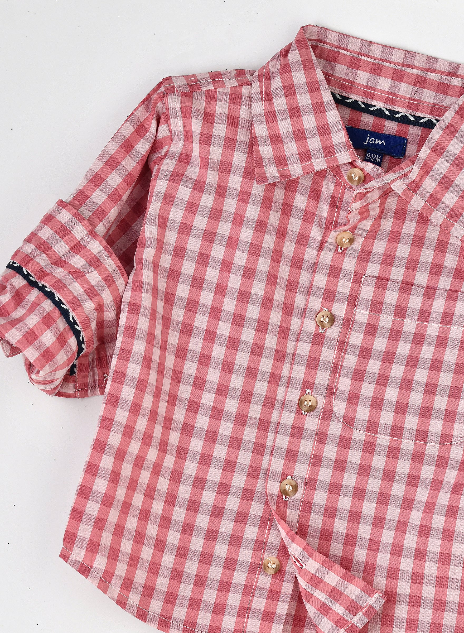 The Boys' Pink and White Gingham Checkered Shirt offers a perfect of style and comfort. The classic gingham pattern in pink and white makes it ideal for both casual and semi-formal occasions. Crafted from soft, breathable cotton, this long-sleeve shirt ensures comfort throughout the day. It features a button-up front and a chest pocket for added functionality. The sleeves come with roll-up tabs, allowing for versatile styling options - wear them long or rolled up for a more relaxed look. Whether for family gatherings, playdates, or school, this gingham shirt is a must-have in every boy's wardrobe.