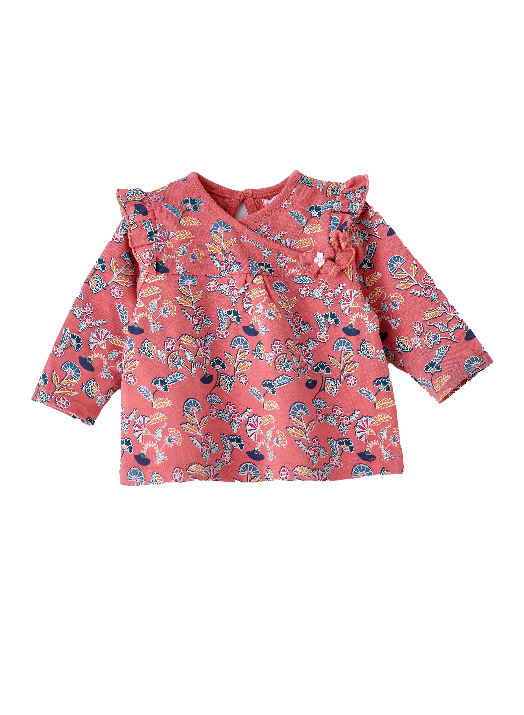 Cute baby coral top with floral print and ruffle detail. Made from breathable cotton for a comfortable fit.