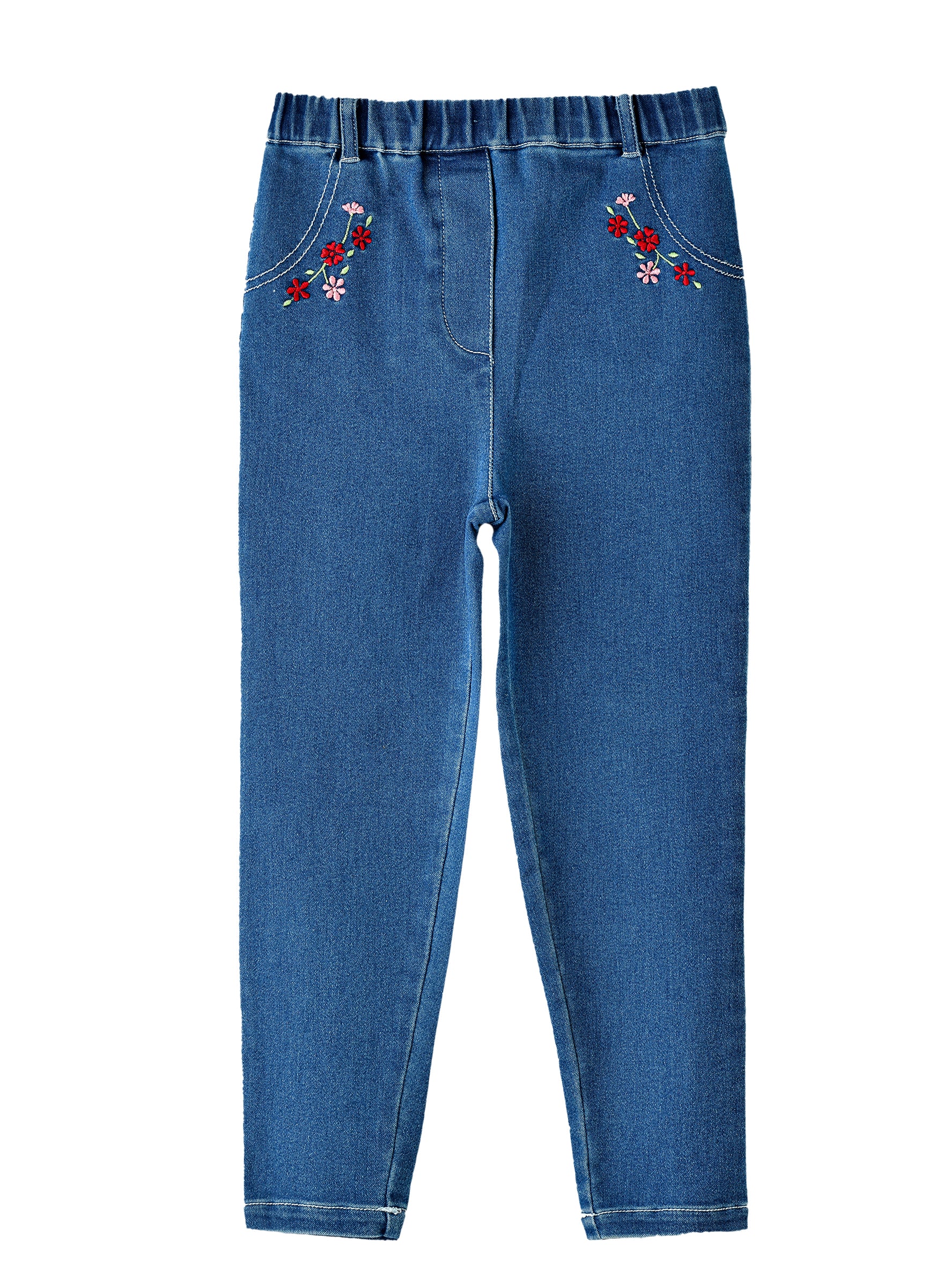 These stylish girls' denim leggings feature embroidered floral details and an elastic waistband. With a skinny fit, they provide comfort and style for any casual occasion.