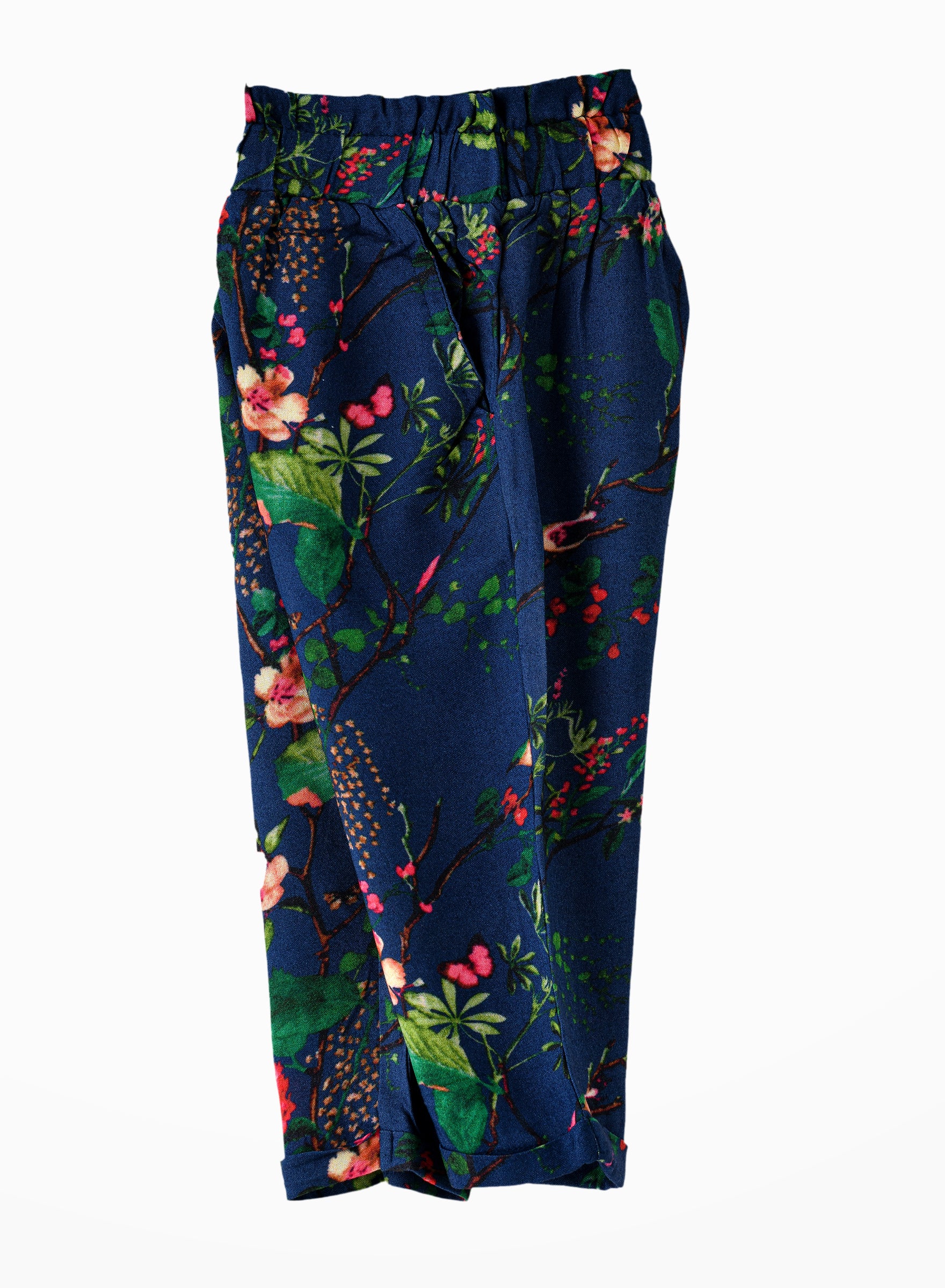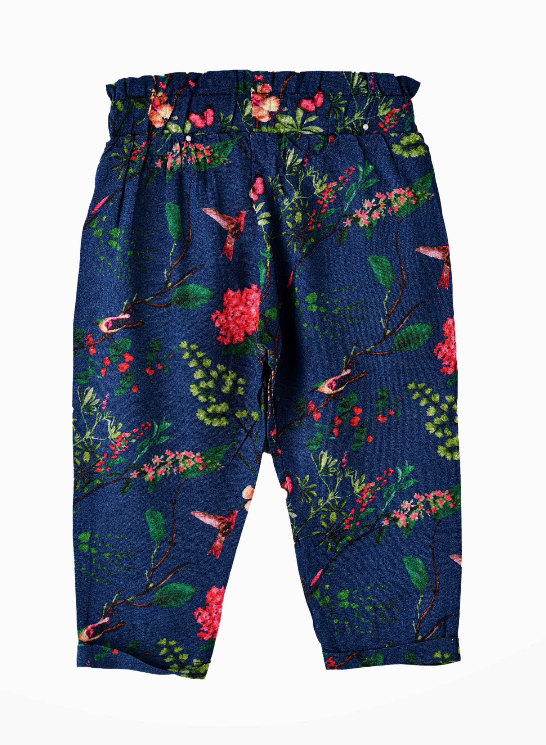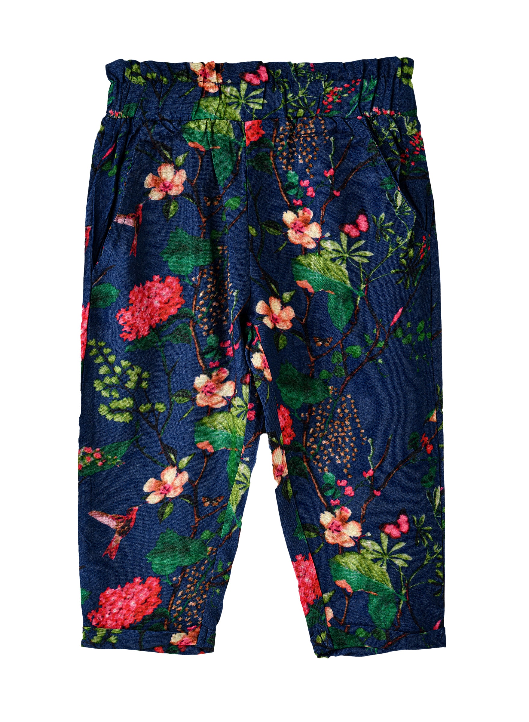The vibrant floral pattern adds a burst of color, making them a great choice for everyday wear or special occasions. Crafted from lightweight viscose fabric, these pants offer a soft, breathable feel that keeps her comfortable throughout the day. The elastic waistband ensures a secure yet comfortable fit, making them easy to pull on and off. With a tapered fit and functional side pockets, these pants are as practical as they are stylish. Pair them with a solid top or matching floral pieces for a coordinated look.
