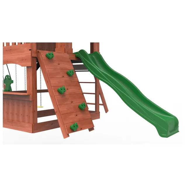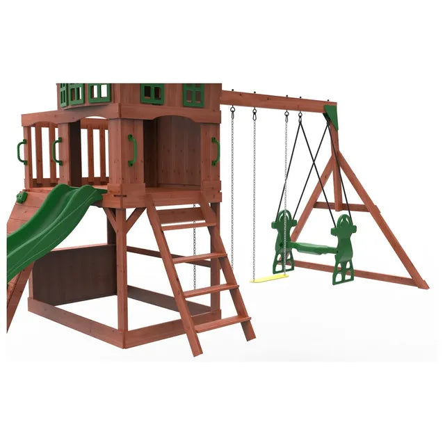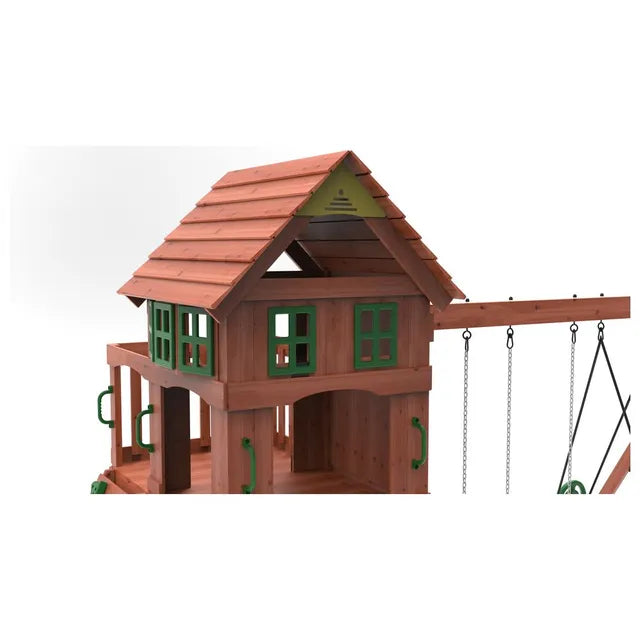 The Playful Peaks Swing Set takes fun to new heights with its exciting treehouse design, complete with an outdoor balcony for extra adventure. Kids can race down the slides, climb to their heart's content, and enjoy two swings plus a two-way glider swing for extra thrills. The charming window lets them shout out to their friends and announce that the fun is in full swing! With endless play possibilities, it's the perfect set for those ready to explore, laugh, and make memories.