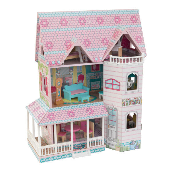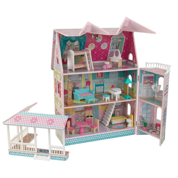 The KidKraft Abbey Manor is a new way to play. This clever Victorian dollhouse uses a double-hinged design to open up for imaginative fun, or fold away for convenience. The gorgeously-detailed roof and wing open up to reveal three levels and five charmingly-illustrated rooms. The detailed wraparound porch can be removed to create new floorplans. The third-level balcony offers a perfect imaginative view for dolls to enjoy. With 16 detailed accessories, kids can create the perfect getaway for dolls up to five inches.
