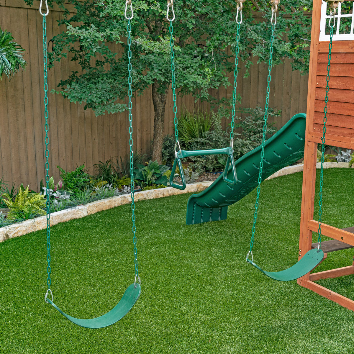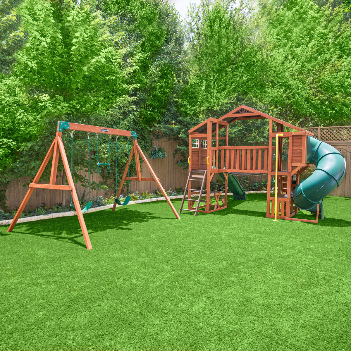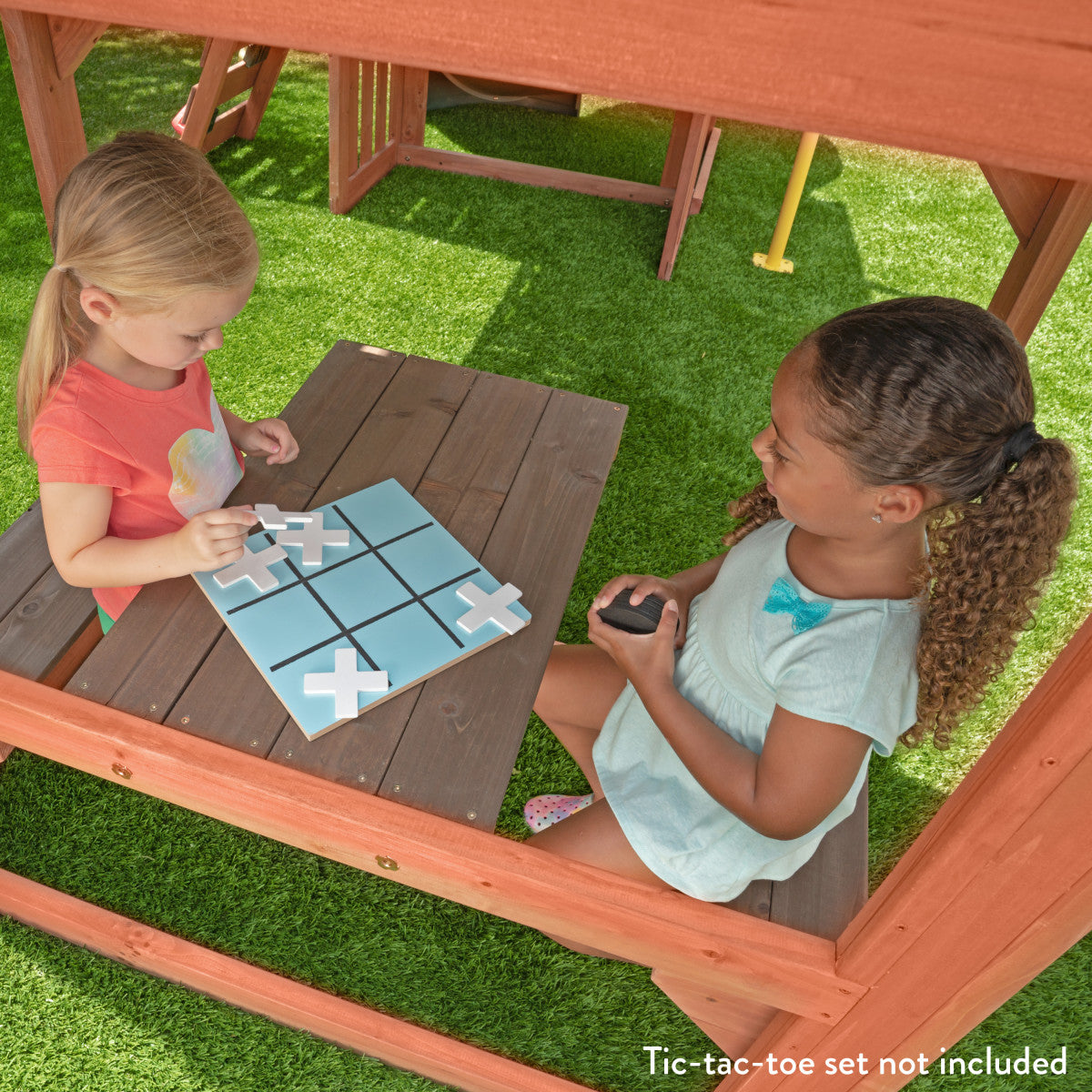With the KidKraft Boulder Bluff 2-in-1 Wooden Swing Set, you don't have to sacrifice fun and style because of your backyard size. Whether you have an expansive lawn space or smaller area, the versatile setup options of the Boulder Bluff let you decide the design layout of your outdoor playset. Set up as one complete set, with the swings extending from the side. Or, break it up into two different play areas-a fort/slide combo for up and down action and then a swing beam for back-and-forth soaring to the sky. With a cool clatter bridge, built-in kitchen, two slides and a picnic table set, this wooden swing sett for children has everything needed to keep them busy, active and entertained for hours.