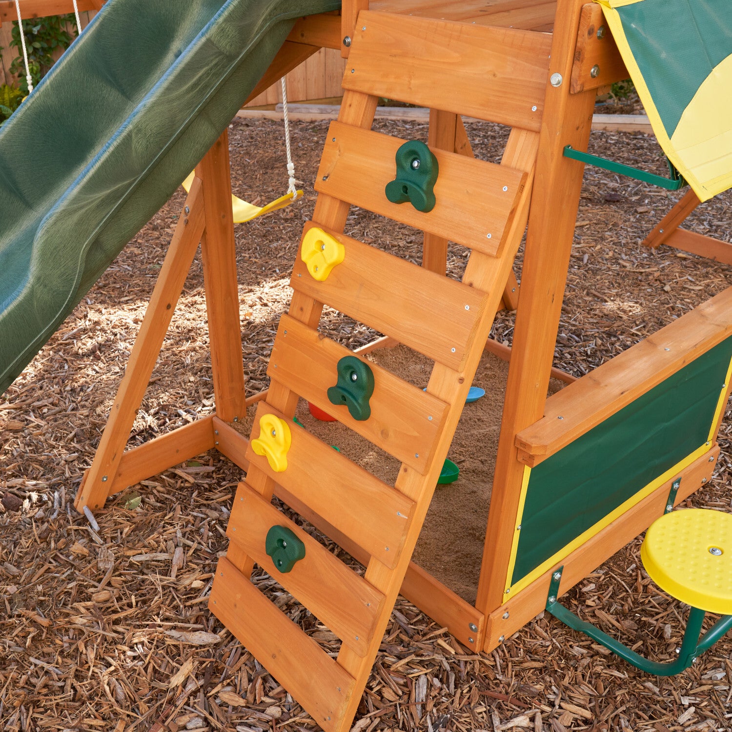 Grounded types might opt for a dig in the large, shady sandbox; others may prefer to perch comfortably on the bright yellow stools at the shaded café table. Solid premium cedar construction with a warm, amber pre-stain will have grownups smiling, too—especially since it’s kid-friendly and environmentally safe. In fact, your backyard just might become everyone’s happy place with this wooden swing set. We don’t call it Brightside for nothing.