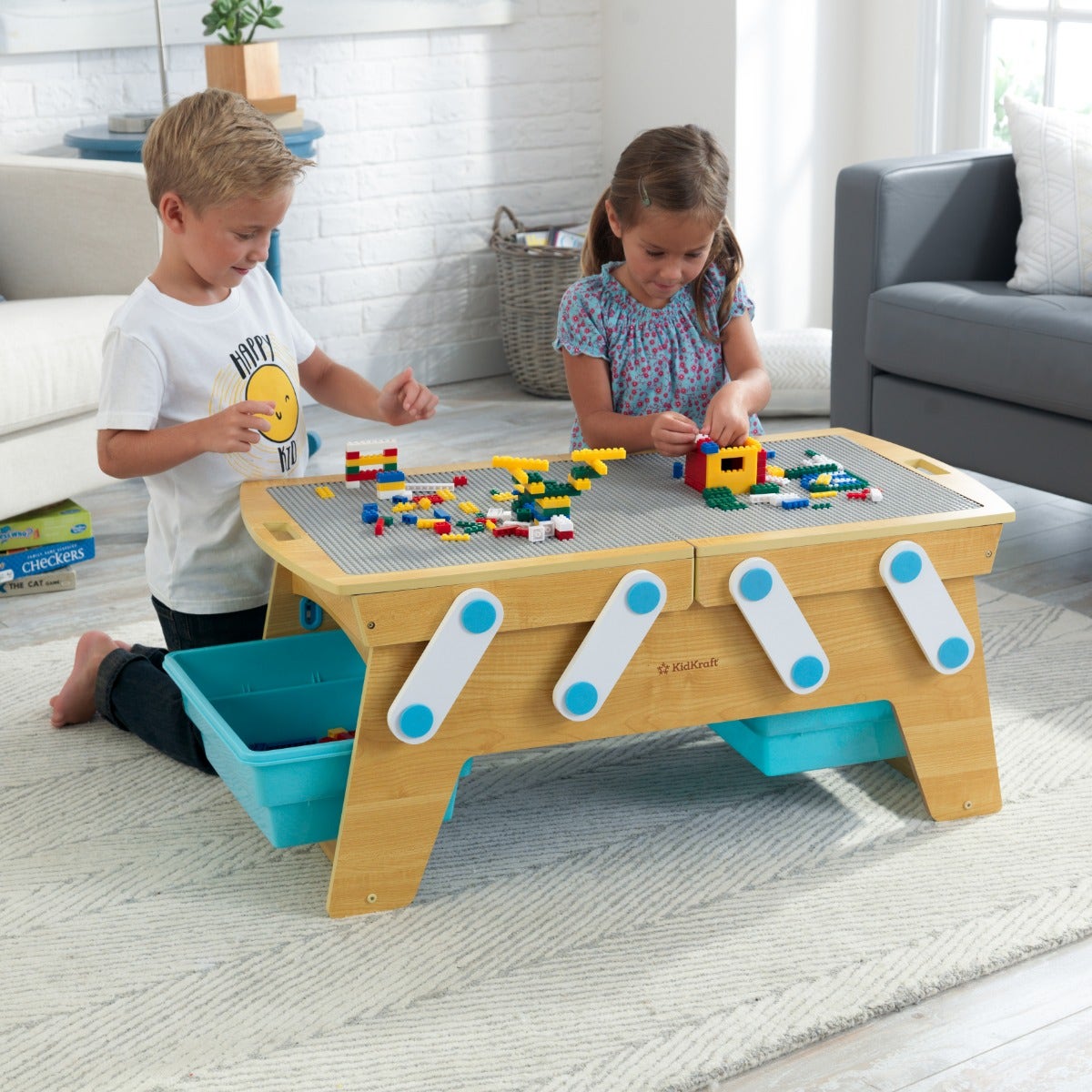 The pinch-free design allows little fingers to safely open the table top and push the building blocks into the center storage bin when fun is done. If little ones aren't yet finished with their masterpieces, simply slide out the two side storage bins and place the unfinished creations inside to be completed later! Made to love and built to last, the KidKraft Building Bricks Play N Store Table is constructed with solid wood materials, so it stays a favorite in playrooms for years to come.
