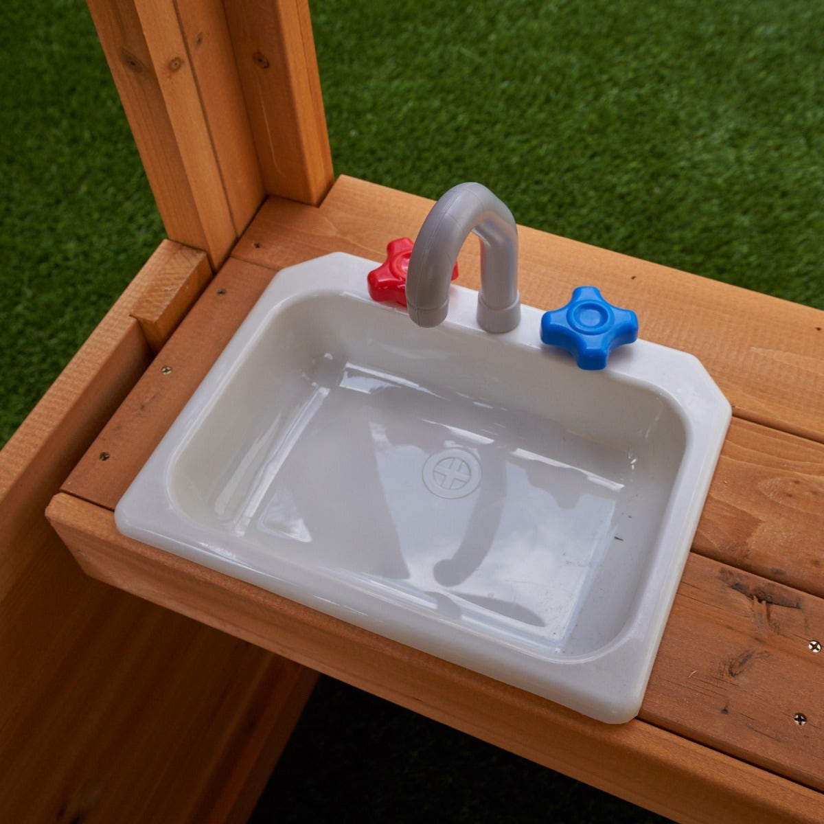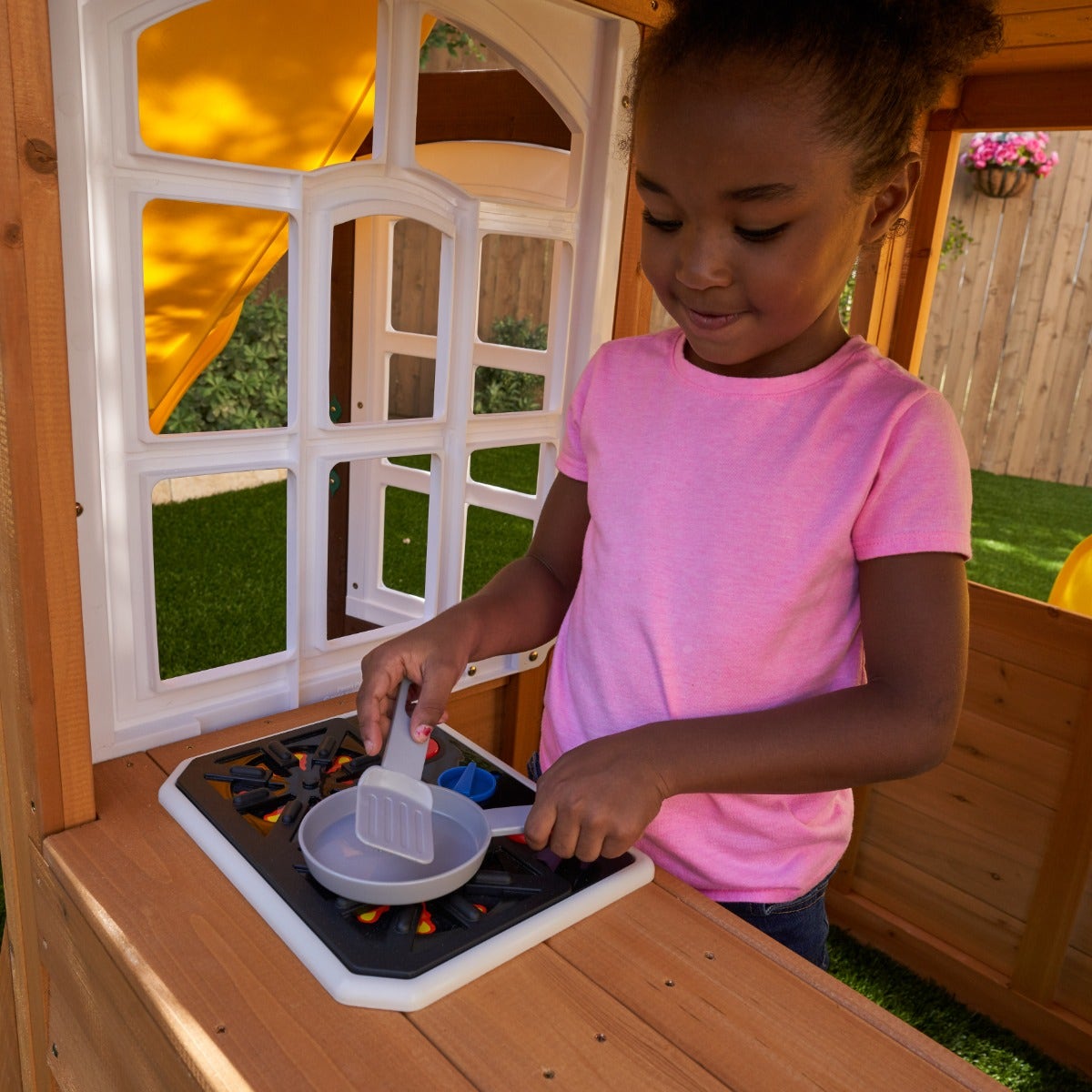 Let kids play and run wild in the backyard with the ultimate play destination, the Castlewood Playset by KidKraft. Big enough for up to 10 energetic kids to play on at once, this giant playset inspires kids to enjoy the fresh air and sunshine as they stay active outdoors. Kids can cook up fun with the play kitchen and included accessories in the lower-level clubhouse.