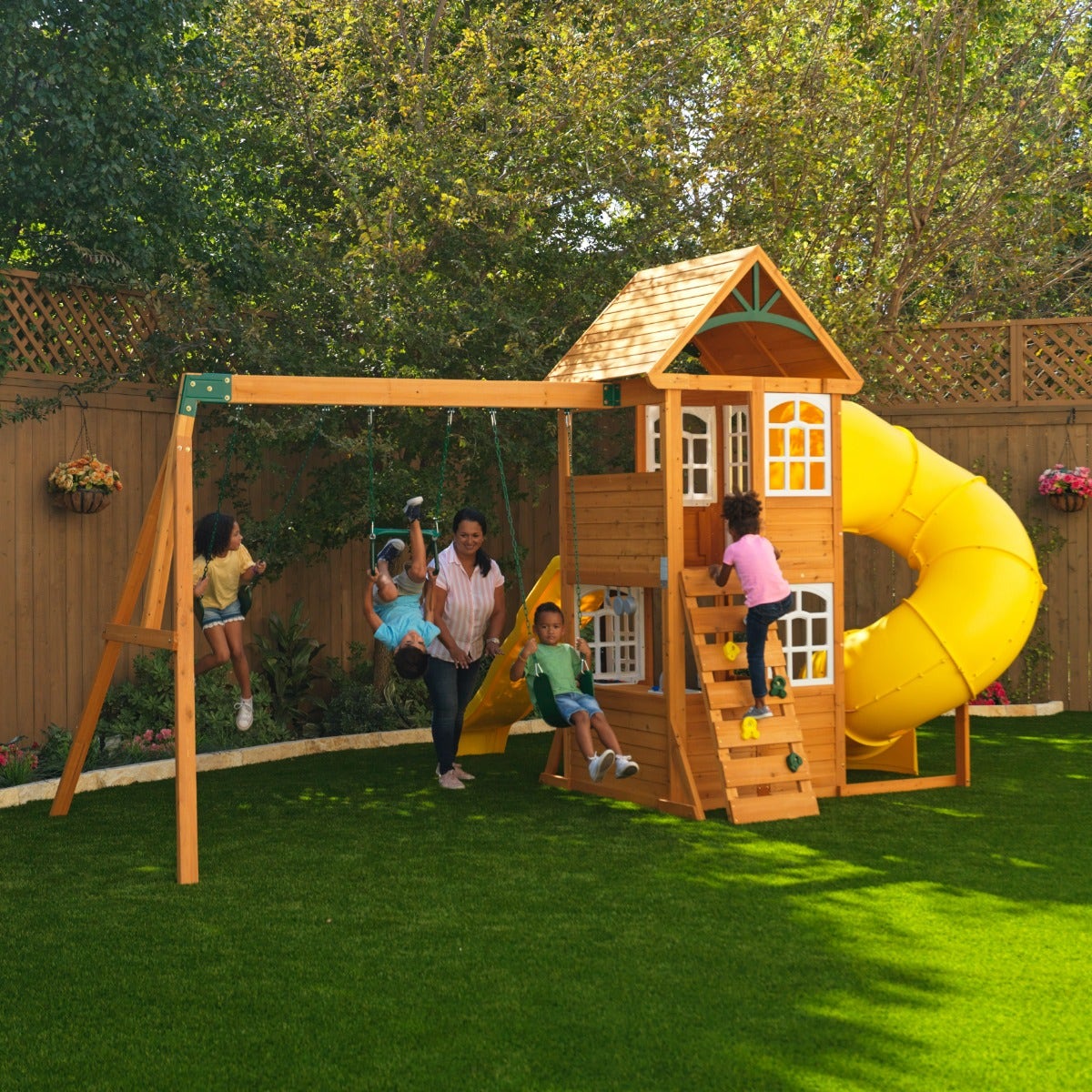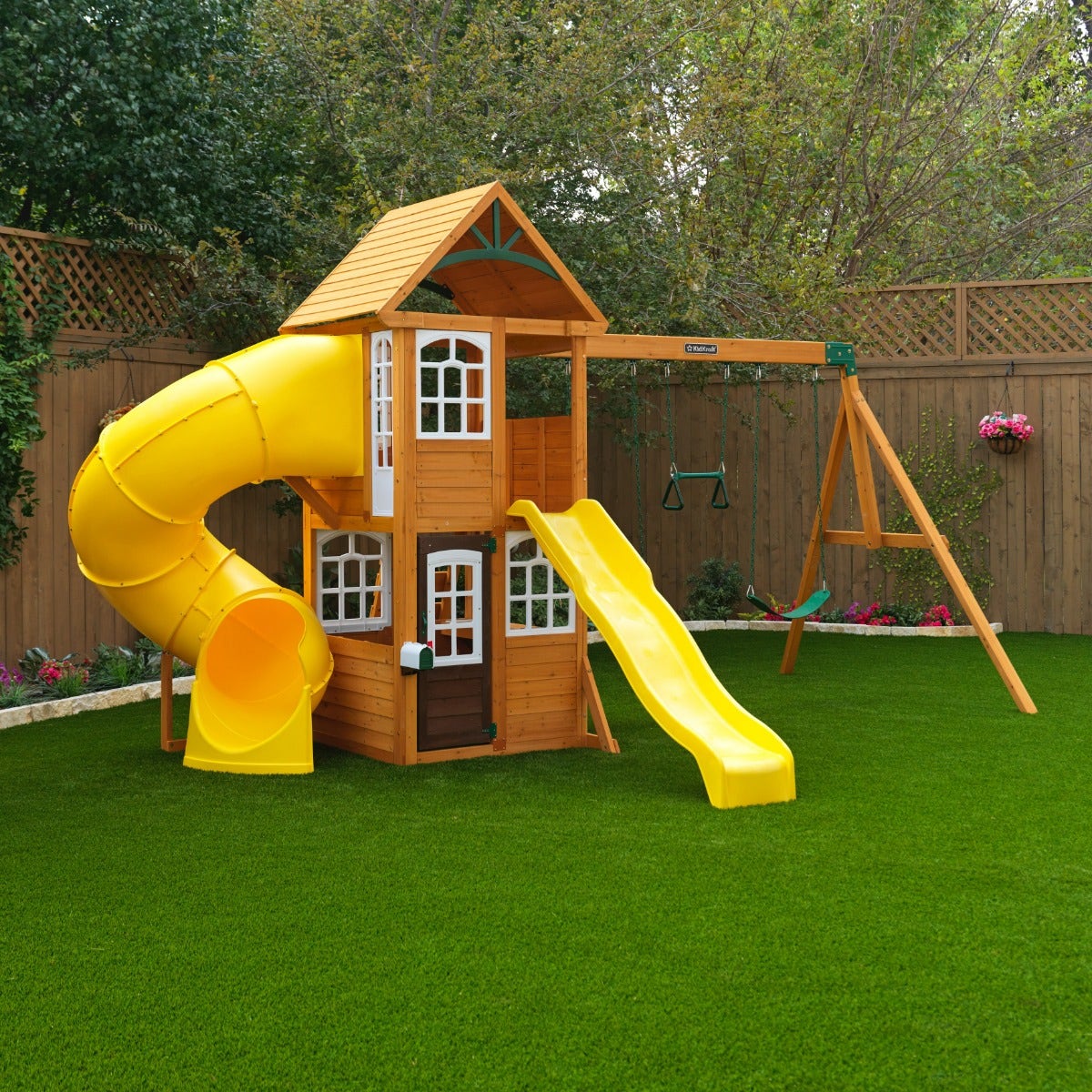 After pretend mealtime, watch as little ones climb the ladder to get to the top of the clubhouse. Giggles can be heard as kids slide all the way down the twist n' ride tube slide and down the bumpy high-rail wave slide. The solid wood swing set entices little adventurers to soar high on two sturdy belt swings and an acro bar swing.