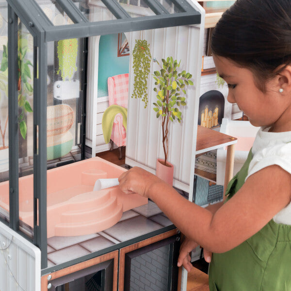 Bring make believe to life with the Celeste Mansion Dollhouse from KidKraft. A dreamy house for 12-inch dolls, this enormous home features four floors packed with exquisite details. Your child's dolls can ride up and down in style in the working elevator, throw a fancy party in the patio area with working lights, relax in the greenhouse with a built-in jacuzzi or stargaze with their very own telescope.