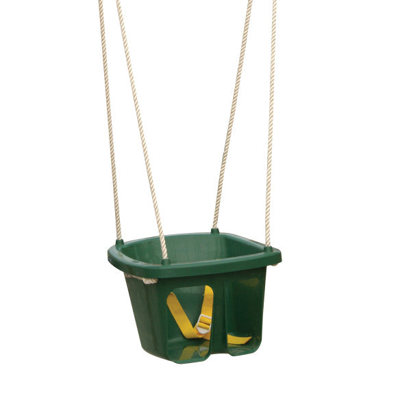 Get your littlest member of the family involved in the fun outdoors with this molded plastic child swing. A bucket design with a high back and leg holes comfortably support your child ages 6 to 24 months. Introduce toddlers to swinging and teach them how to hold on to the ropes, which are designed to not chafe little hands. Trade out an existing swing on your playset for this one and then switch out as kids grow.