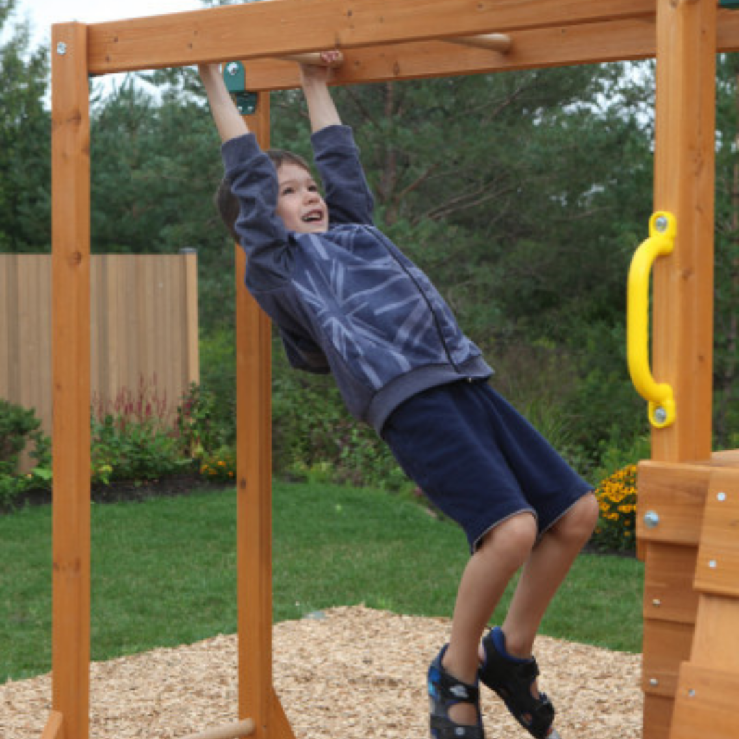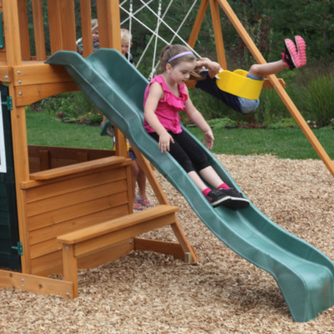 We love the compact configuration of this all-in-one play set / swing set combo. Up to eleven imaginative kids can explore all that the Cranbook Swing Set / Playset by KidKraft has to offer at a single time. And what child could resist the thrill of the high-rail wave slide or the challenge of climbing the multi-colored rockwall ladder to the upper-level clubhouse? A swing across the monkey bars offers additional access to the upper level, where a gabled shiplap roof provides a shady spot for retreat.