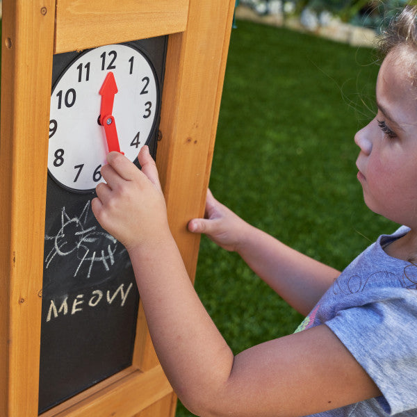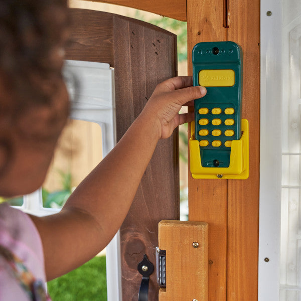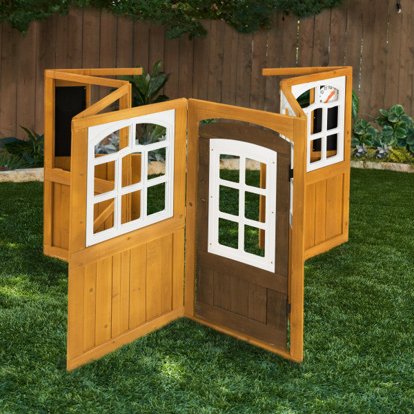 The KidKraft Garden View Playhouse is built to inspire imaginative play in a beautiful house that's full of fun and excitement. Kids will love playing for hours in this house packed with exciting details like a working doorbell, a phone with clicking buttons, a clock with moveable hands and a functional mailbox. Little ones will be delighted as they walk through the front door and enter the playhouse with decorative windows. Featuring large serving windows with a cafe-style canopy, two chalkboards to display the menu of the day and a cute planter box, the KidKraft Garden View Playhouse creates the ultimate fun destination for kids.