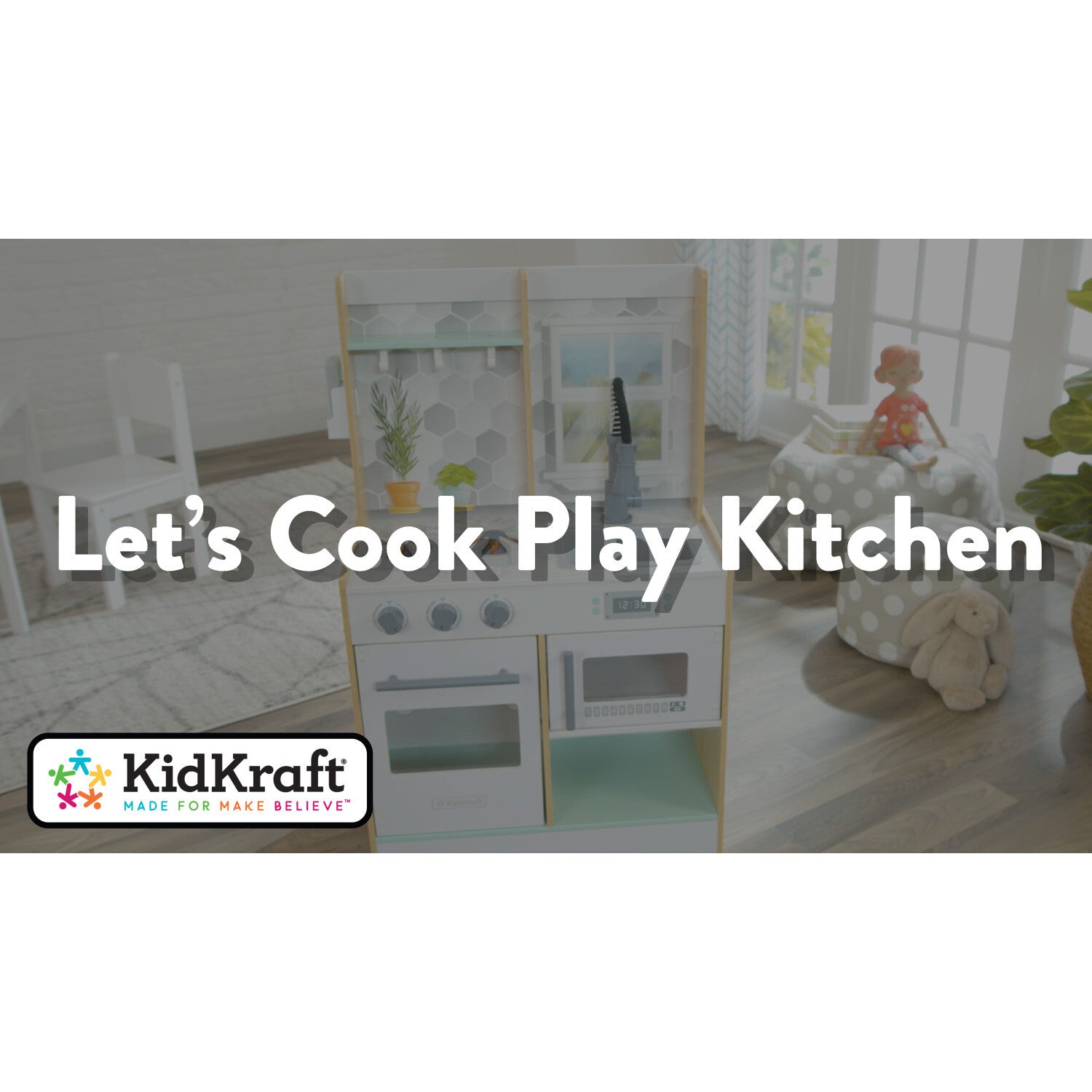 The KidKraft Let's Cook Wooden Play Kitchen is positively packed with interactive features. Clicking, turning oven knobs, opening appliance doors, a pull-down faucet and realistic burners with lights and sound provide hours of fun for aspiring chefs. Shelving and hooks provide plenty of storage for play food, flatware or anything little chefs need to create imaginative meals for their family. A play phone clips to the side of the cabinet for hands-free fun. Made to love and built to last, the KidKraft Let's Cook Play Kitchen is designed to spark imaginative fun in the playroom for years to come.