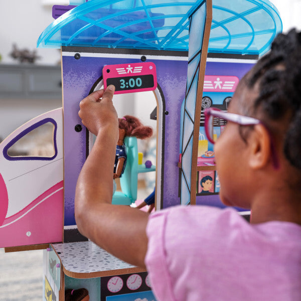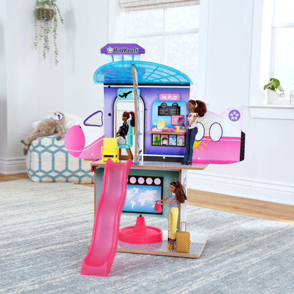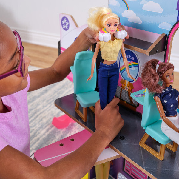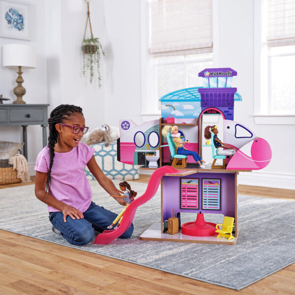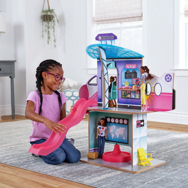 Travel in style with the Luxe Life 2-in-1 Airport & Jet from KidKraft. This wooden play set provides a unique site for dolls to act out adventures. All aspects of plane travel are represented, and with the spinning base, it's easy to go between the two sides. Check in and grab your boarding pass when you arrive. Then venture upstairs to grab a quick snack before your flight.