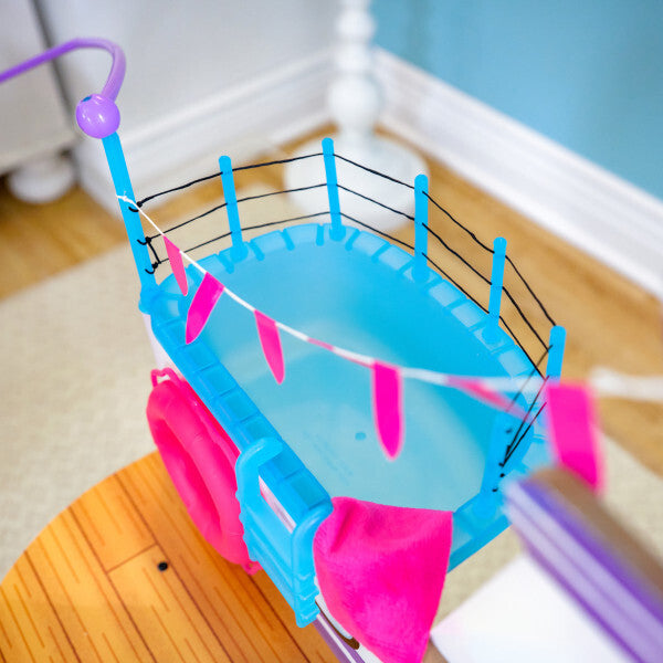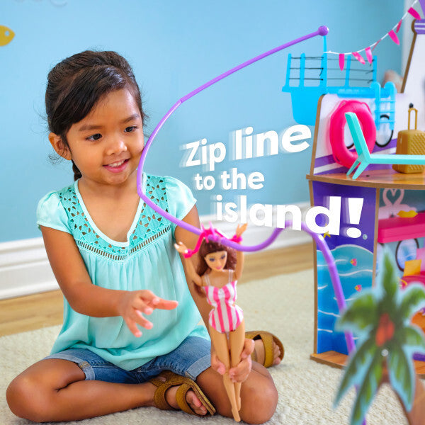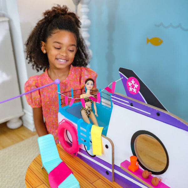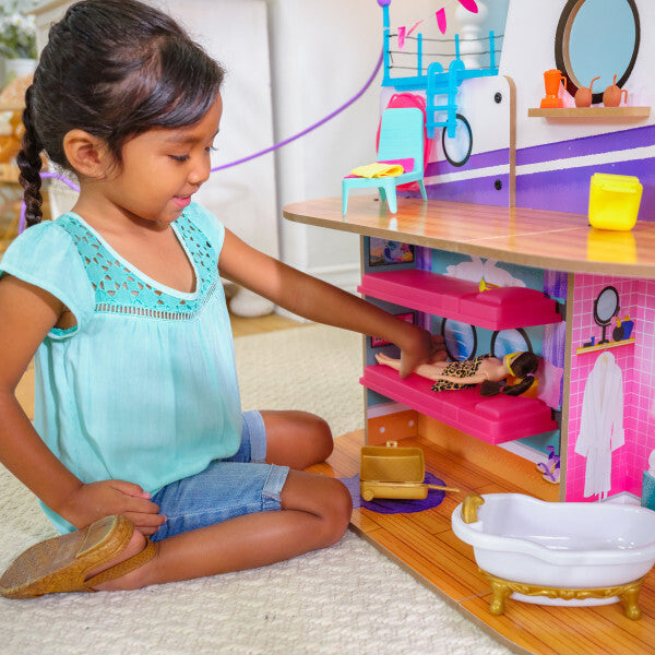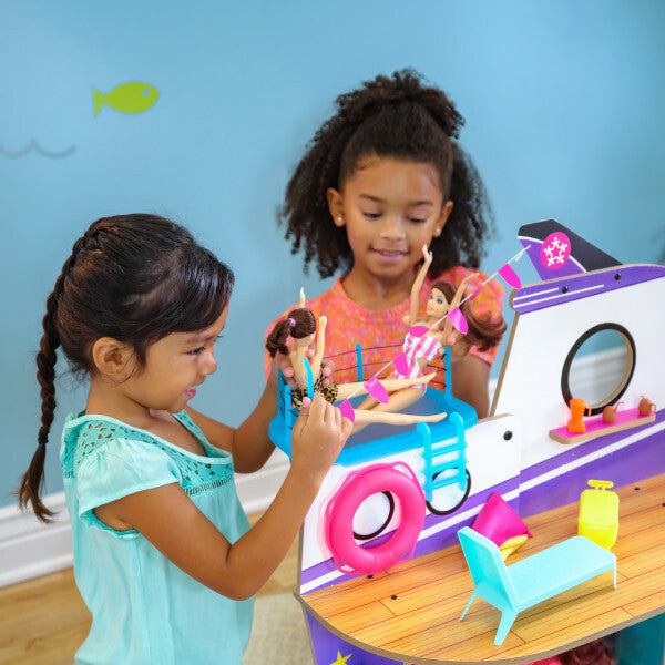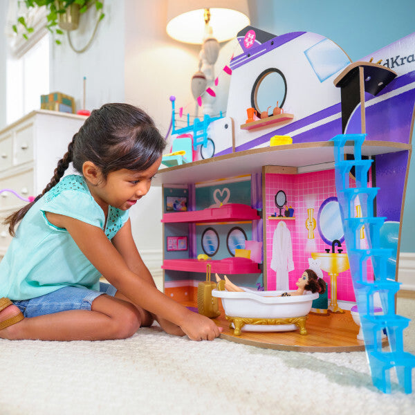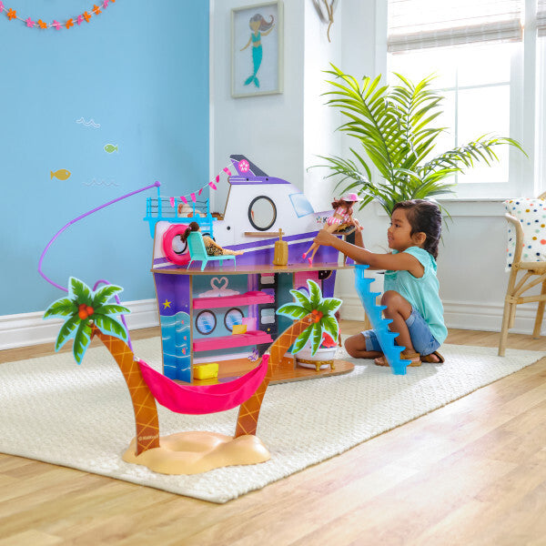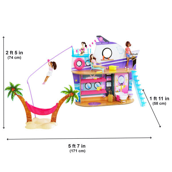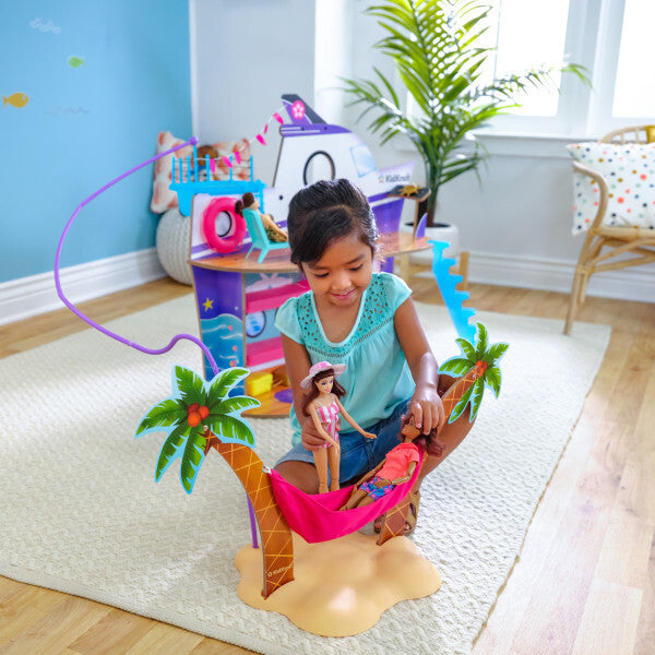 Travel in style with the Luxe Life 2-in-1 Cruise Ship & Island from KidKraft. This wooden play set provides a unique site for dolls to act out adventures. Board the ship and check out your stateroom, complete with fun bunk bed and a luxury private bathroom. Notice the towel animals in the graphics—just like on a real cruise. After unpacking your luggage, take the stairs to the upper deck to enjoy a little relaxation and a fruit smoothie, perhaps Splash in the pool to cool off.