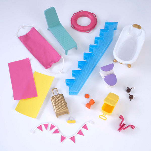 - 18 play pieces including fun travel accessories such as tropical drinks, hammock and luggage