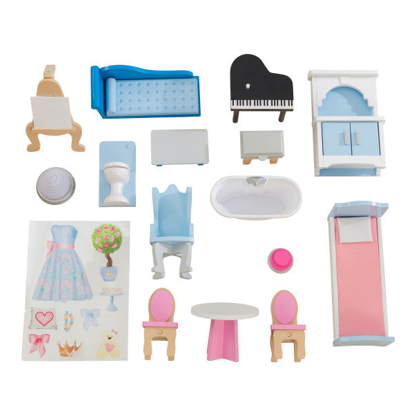 Fantasies come to life for 12-inch dolls in the Magical Dreams Castle Dollhouse from KidKraft! Full of dreamy details, this dollhouse has a grand staircase that leads up to a garden patio. Fully furnished with 16 pieces of furniture and accessories, this house is ready for royal celebrations - there's even a tiered party cake! Kids can get more hands-on in the palace with interactive components - cabinet doors open and close, piano and toilet make sounds, chandelier lights up, and there's even a post-in note easel for impromptu artwork.