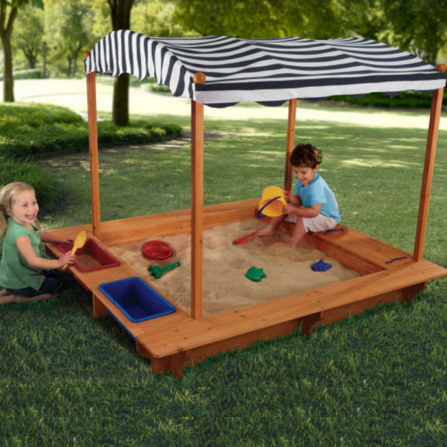 With the KidKraft Outdoor Sandbox with Canopy, kids get to dig for treasure and build sand castles in their own backyard. This adorable wooden sandbox is made of weather-resistant wood and comes with a mesh cover that protects the sand when not in use. The canvas canopy provides shade for little explorers and two removable plastic bins are great for storing toys or holding water or sand