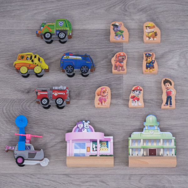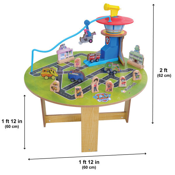 Trouble in Adventure Bay? Not to worry-PAW Patrol is ready to save the day! With the PAW Patrol Mission Ready Activity Table by KidKraft, it's easier than ever to get a view of the land from the Lookout Tower and then swoop down to ground base to make the rescue. The zipline lets Skye and her helicopter travel to three different locations on the board. Simply insert the zipline into the corresponding holes and fly away! Join the rest of your pals-Ryder, Chase, Rubble, Rocky, Marshall and Zuma- to keep a watch on the land. Launch vehicles from the lower level of Lookout Tower to really make them "go, go, go!" With seven characters, five vehicles, two buildings plus street graphics on the table, this set will let kids create brave and heroic adventures again and again. Clear the table of toys and use as a snack table, art table and more! Made of wood, this activity table for kids will last through many make believe playtimes.