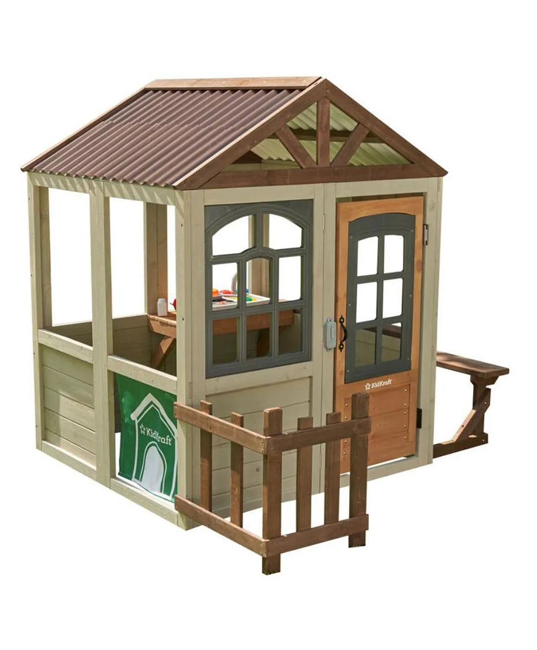 Trailblaze a new path of play with the KidKraft Pioneer Cottage Playhouse. Rustic vibes mixed with interactive features makes this wooden outdoor house a cozy place to call home. Greeted by a quaint picket fence half yard, kids can ring the doorbell to be welcomed inside. The airy windows provide plenty of breeze throughout, letting multiple children play inside comfortably.