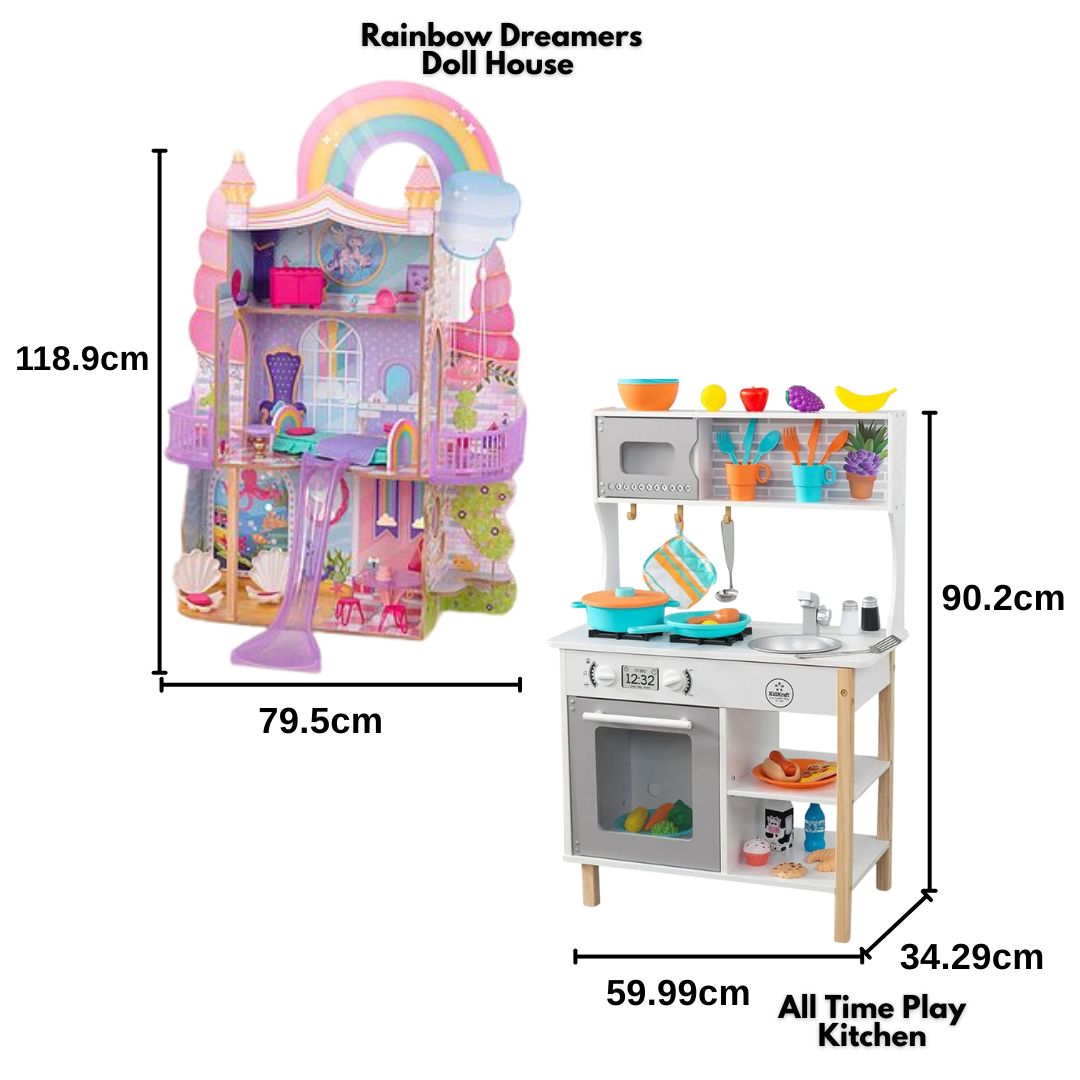 Magic reigns, uniqueness is celebrated, and make believe comes to life in the KidKraft Rainbow Dreamers Unicorn Mermaid Dollhouse. Welcome all one-of-a-kind creatures to this three-story dollhouse. Follow the rainbow to discover a real working swing suspended from a cloud. Shimmering walls are a delightful backdrop to the cheerful furniture. Slide down to enter the mermaid lounge, complete with ornate seashell chairs. A cute Mousicorn friend is with you for every journey. From sky to sea, fantasy worlds collide in the loveliest way in the almost 4-foot-tall Rainbow Dreamers Unicorn Mermaid Dollhouse.