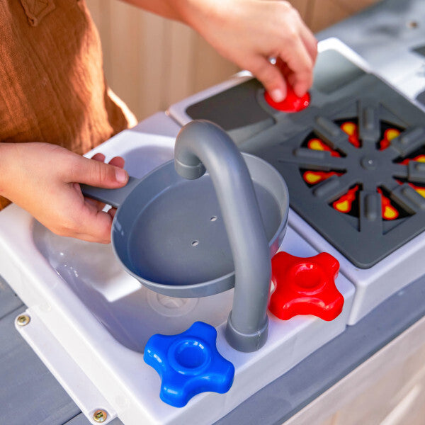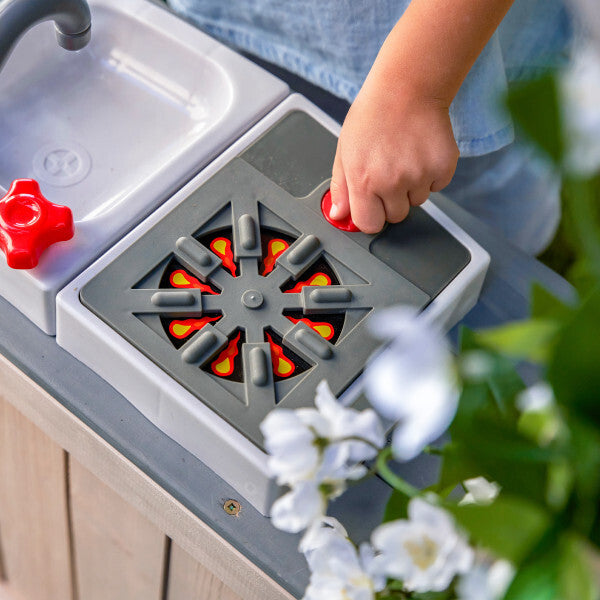 - Play kitchen includes sink, faucet and burner with fire-inspired graphics; includes pot, pan and spatula