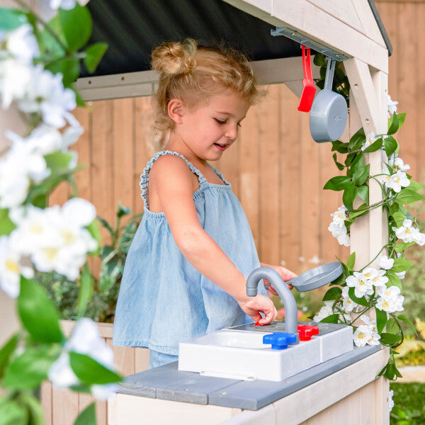 Inside the wooden playhouse, kids will enjoy the amenities of home such as a kitchen area-a sink, faucet, cooktop and pot, pan and spatula to cook up some delicious pretend meals. , , An open-air design on three sides keeps it cool year round and allows parents to keep an eye on the play in the backyard. With durable wood construction and child-friendly, water-based stain, this outdoor playhouse for kids will be a backyard retreat year after year, and is a perfect accompaniment to outdoor swing sets., ,