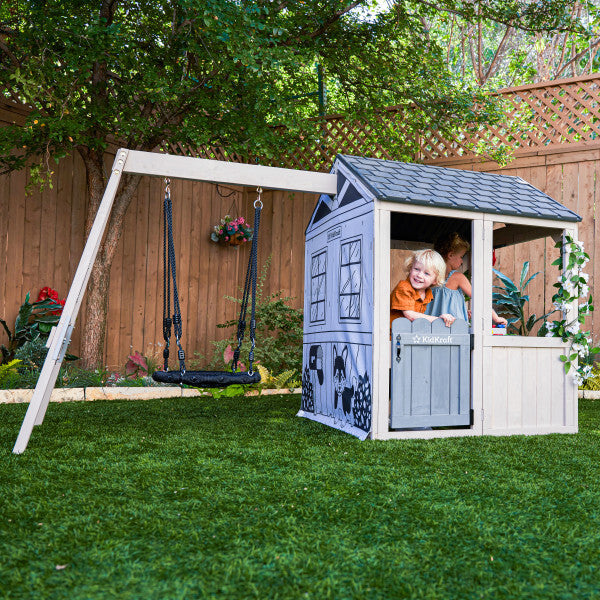 One glance at the KidKraft Savannah Swing Playhouse and boys and girls will want to move right in. This homey charmer welcomes with a calming white paint, dark wooden roof and scalloped half door. The true attraction is the added wood beam with captivating web swing. Kids can plop down in the round seat and enjoy the breeze. The fabric wall nearby shows off exterior graphics that will inspire many happy stories.