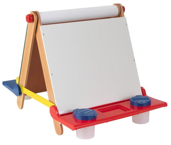Turn any table into an art studio with the KidKraft Tabletop easel. Perfect for artists on the go, this little children's art toy set folds away when craft time is done, and the included spill-proof paint cups seal up. One side features a chalkboard and the other side has a dry-erase surface. A standard-size roll of art paper fastens to the top and unrolls to provide a stable paper surface. This sturdy easel makes this creative toy a great gift for any artistic child.