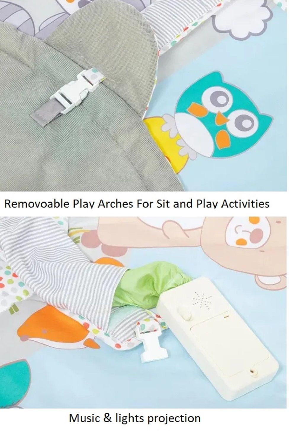 Let your little one enjoy endless fun and comfort with this Baby Play Gym Mat with Music and Light. Designed with soft padding, colorful lights, soothing music, a comfy pillow, and engaging hanging toys, this playmat stimulates your baby’s senses and supports early development. Ideal for tummy time and daily play.