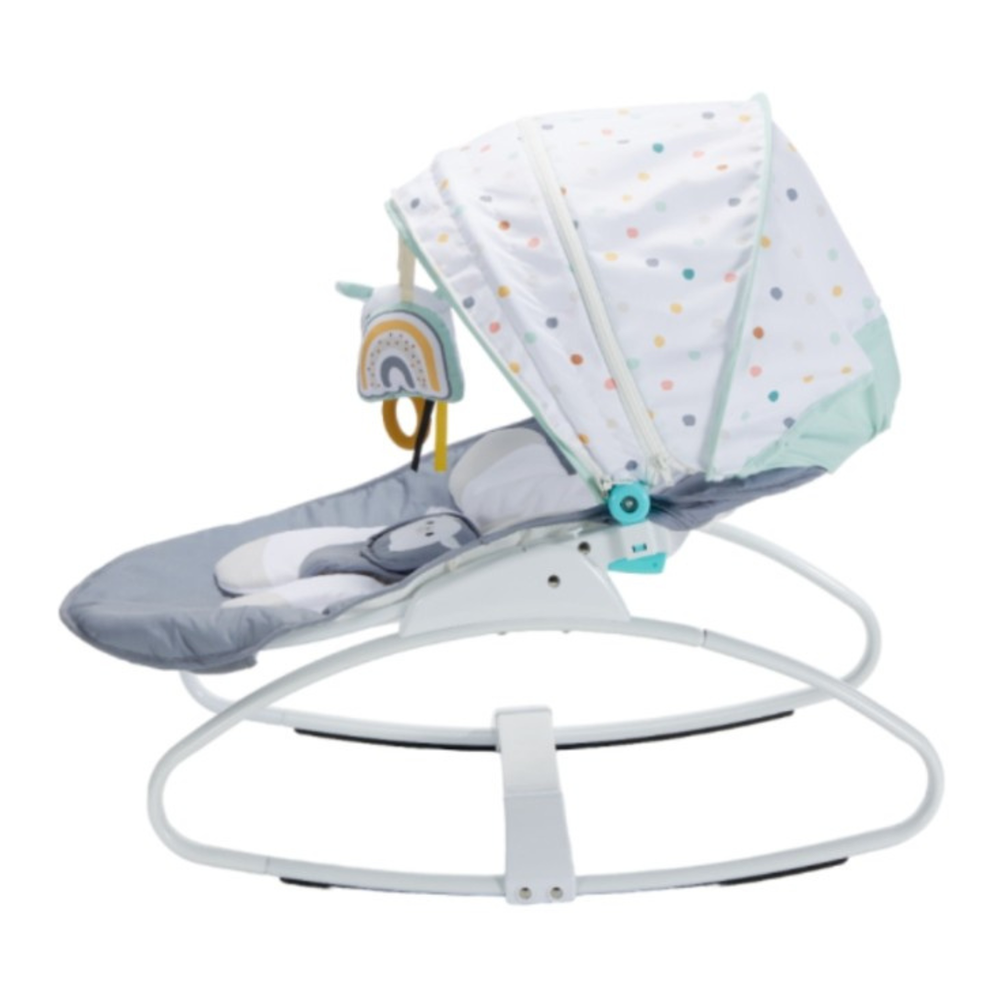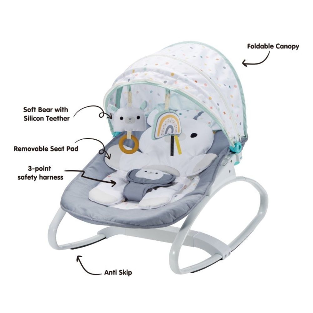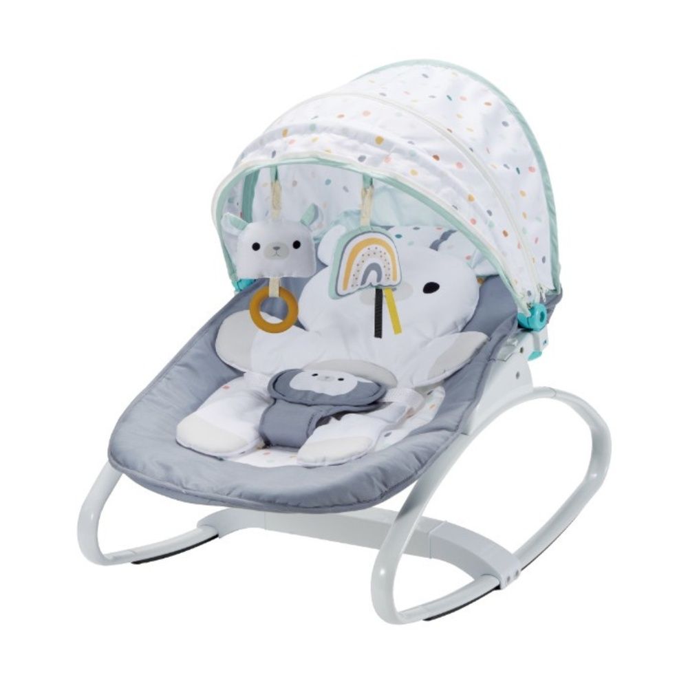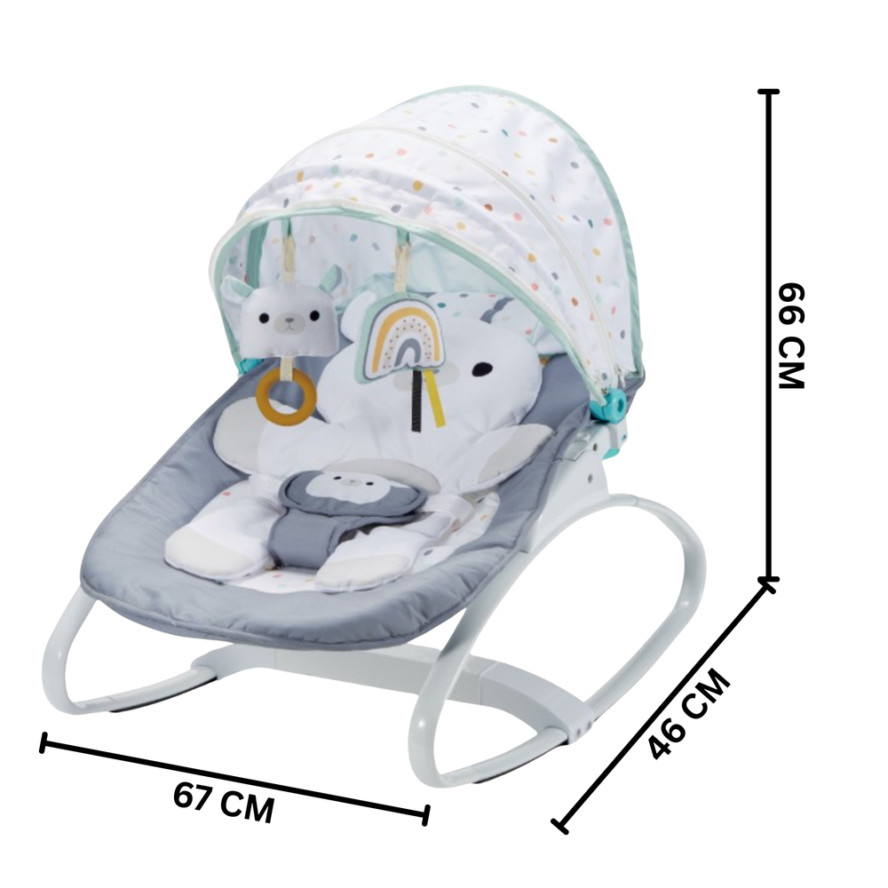 Keep your baby entertained and relaxed with this soft and cozy Baby Rocker Bouncer. It features a cushioned seat with cute animal design, two interactive hanging toys for sensory play, and a foldable canopy for shade. The gentle rocking motion soothes your baby while the secure harness keeps them safe. Perfect for playtime or nap time.
