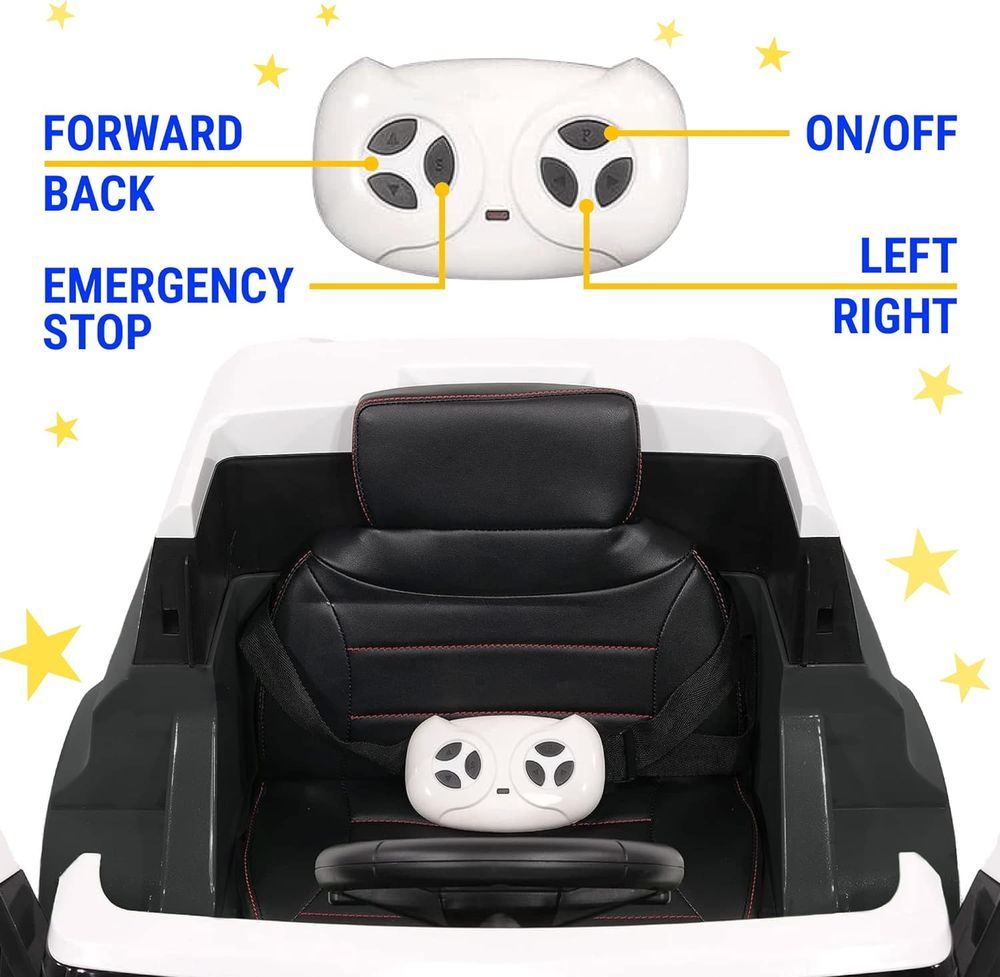 - 12V 1 Person Single Rider Vehicle with Safety Seatbelt that Keeps Children Safe and Secure. Child Safety Locking Doors and Parental Remote Control allows Parents to Override the Childs Driving.