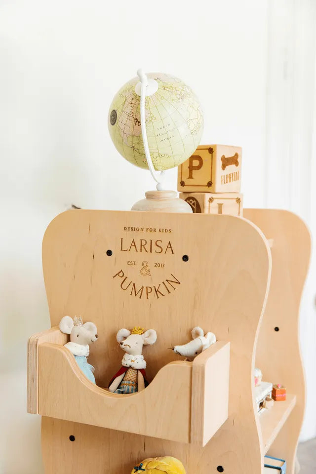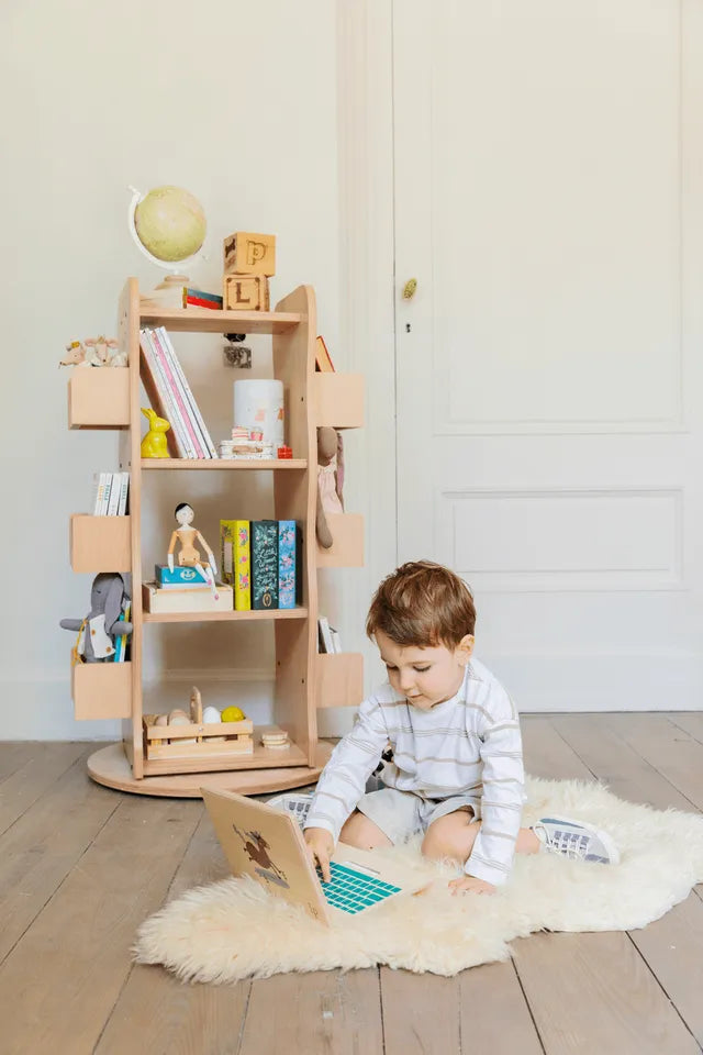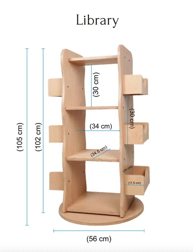 Rotating library, made from 100% natural beech wood, features a 360-degree rotation capability, three main shelves, and six side shelves, making the classic library design more fun and functional. This library allows you to store up to 300 books of various sizes using the front, back shelves, and side pocket shelves.