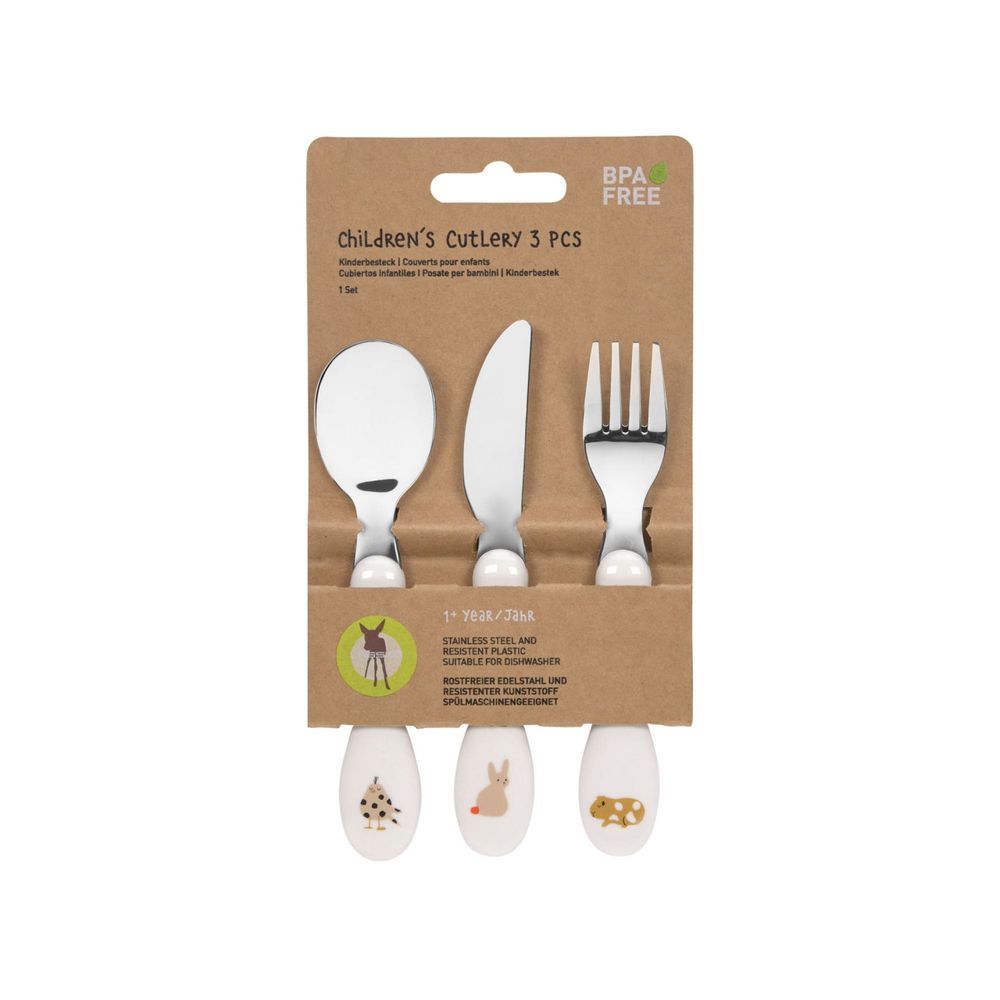 - Set includes knife, fork and spoon.