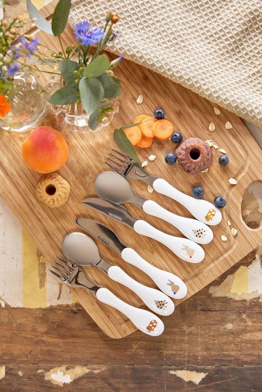 Food tastes twice as good as children's cutlery from Lassig. Small lovely prints adorn the child-friendly handles. The knife, fork and spoon set is BPA-free and made of stainless, non-deformable steel with plastic handles. Thanks to its rounded edges, the knife is also suitable for the smallest gourmets and teaches how to eat independently in a playful way.