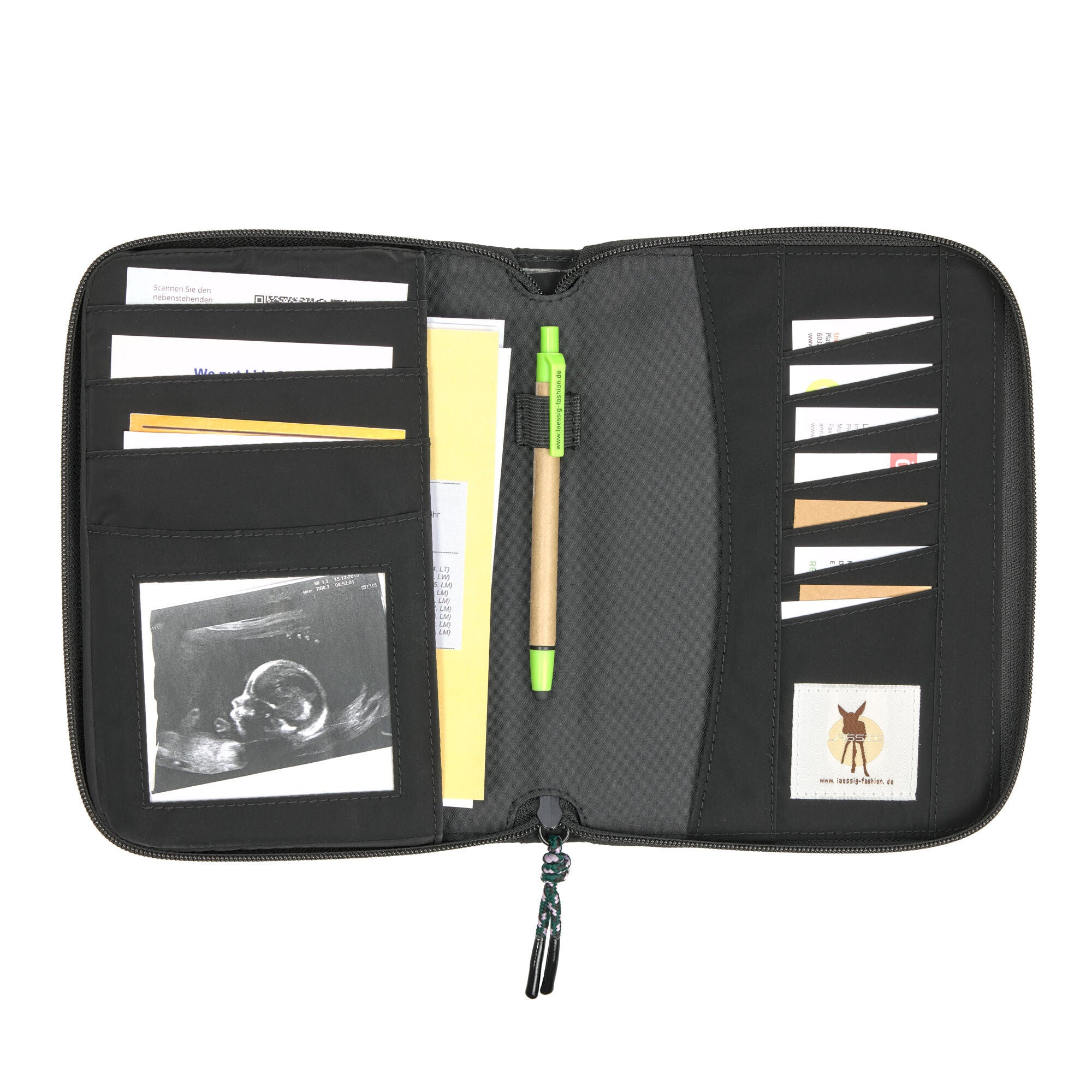 This document pouch from Lassig is a brilliant organizer for the months during and after pregnancy. The all-round zip fastener ensures that your maternity and examination records plus any other important documents are kept safe and secure. This document holder offers enough compartments so you have everything at your finger tips – your maternity record, ultrasound images, health insurance card, examination record and vaccination card.