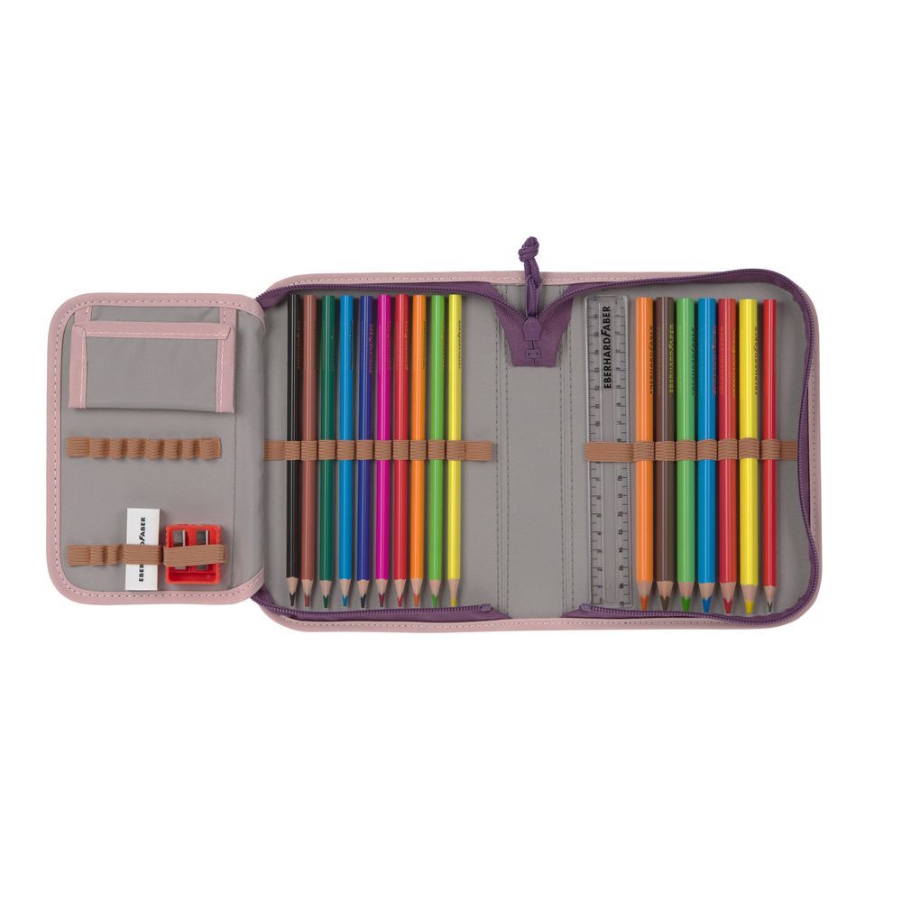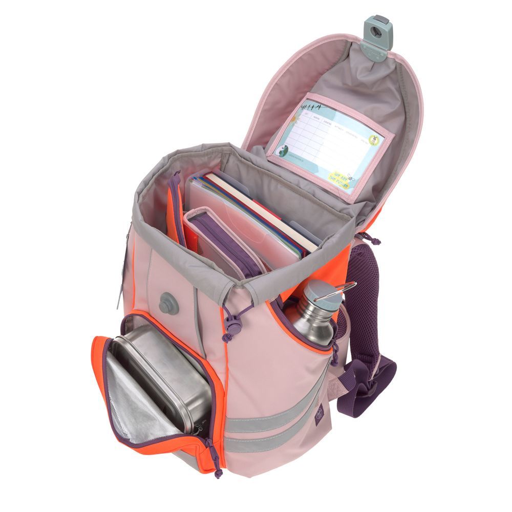 The 7-piece School Set Unique:- School satchel, Gym bag - can be easily attached to the school satchel, Pencil case - equipped with Eberhard Faber pencils and accessories, Soft pencil case - turns into a practical pencil/pen holder, Chest pouch - with key finder, transparent window and zipped compartment, Rain cover - in neon with reflective print, Set with a pendant and 2 patches - gives creativity free rein.