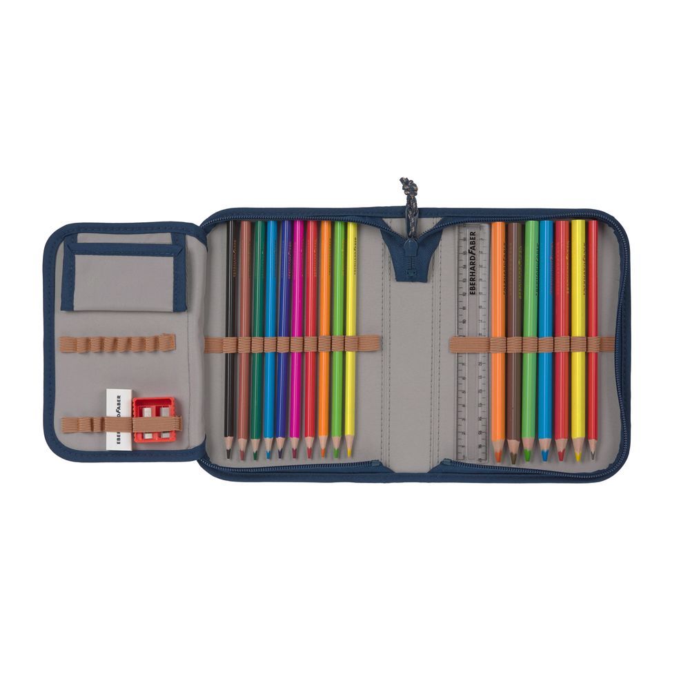 The 7-piece school bag set (1,596 kg) includes:- 1.08 kg school bag, Gym bag: easy to attach to the school bag, Pencil case: Eberhard Faber pens & accessories, Neck pouch with key finder, Rain cover (in the lid): reflective print, Set of pendant